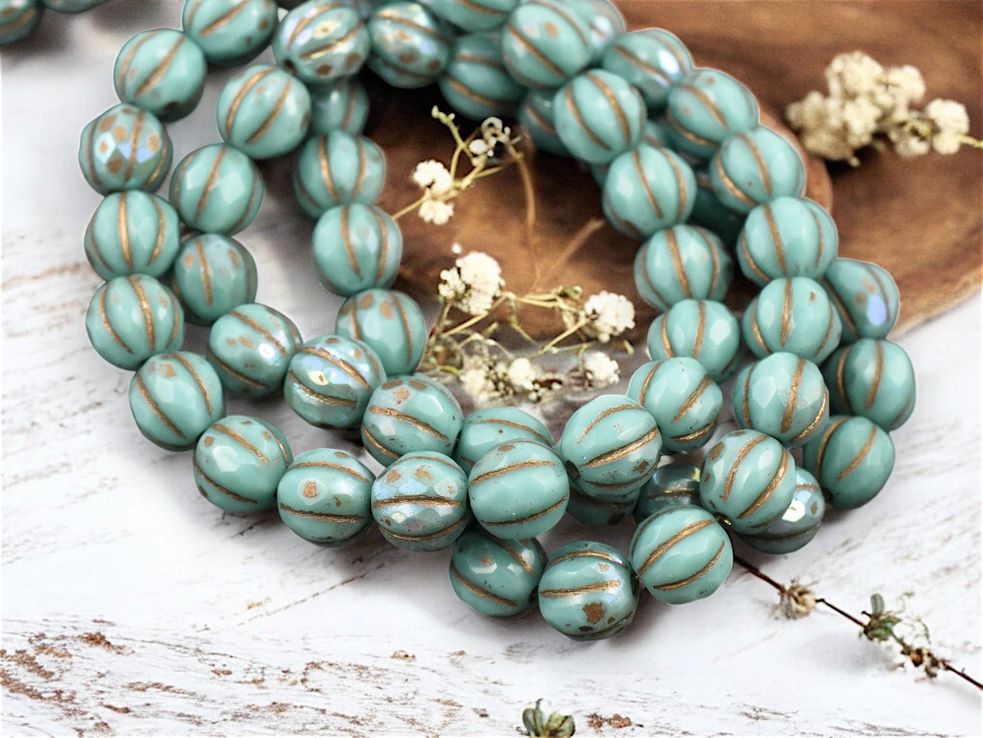 Gold Washed Turquoise AB Faceted Round Melon Beads - 6mm or 8mm