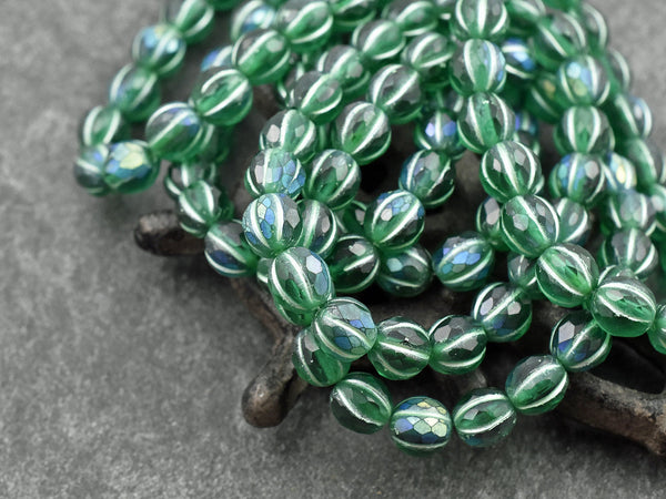 *20* 8mm Green Washed Matte Emerald AB Faceted Round Melon Beads