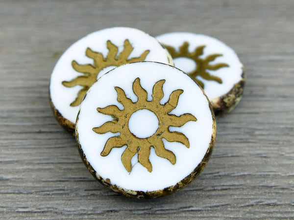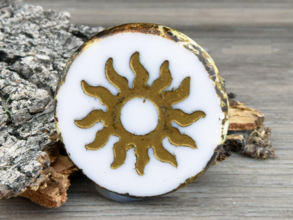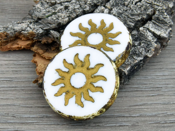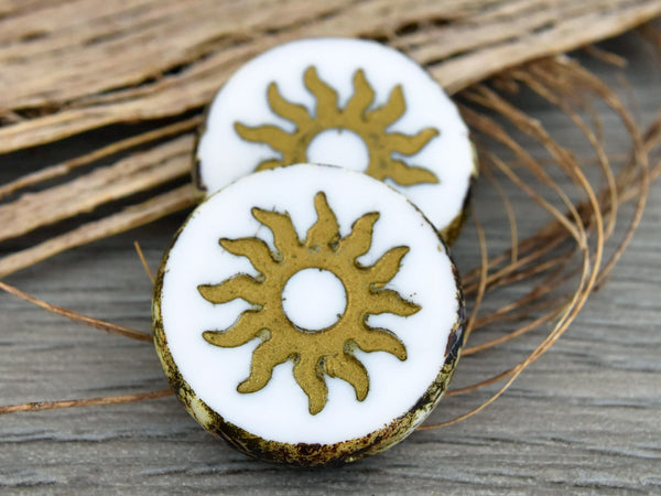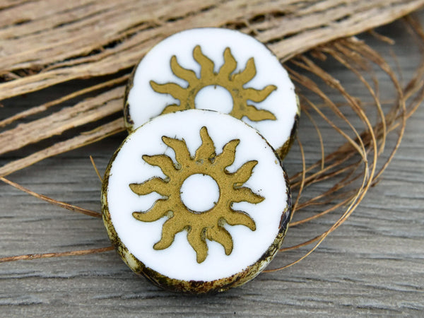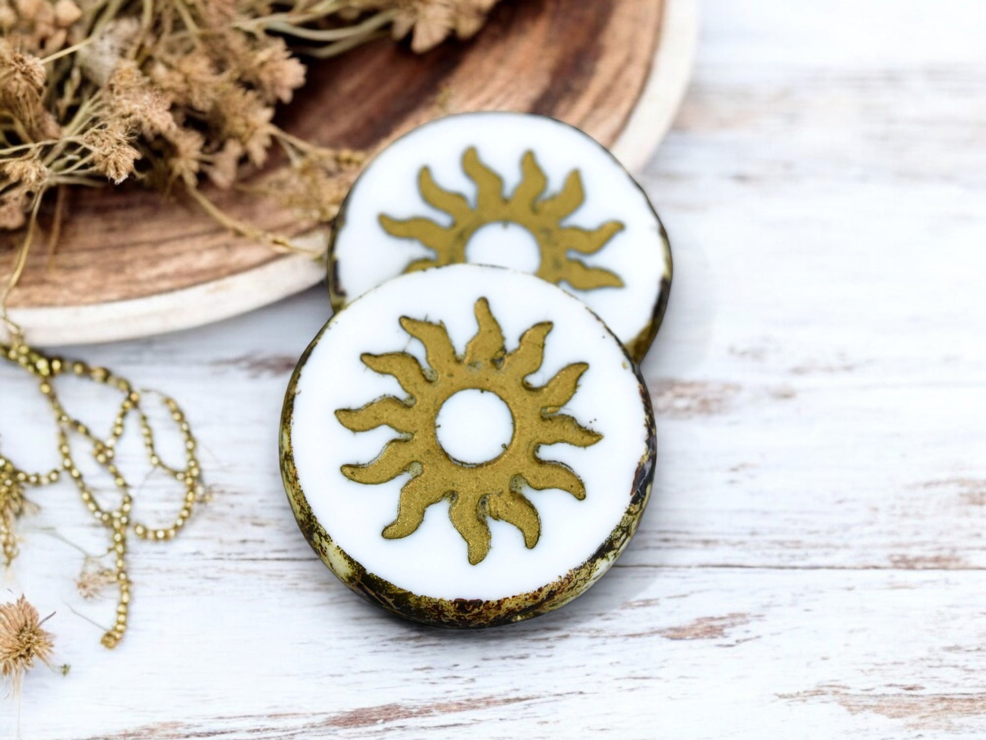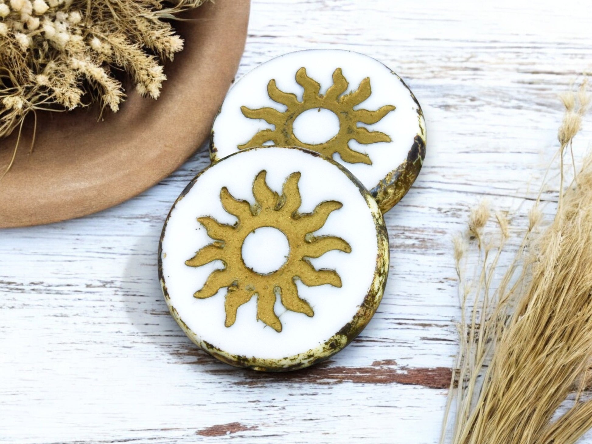 *2* 21mm Bronze Washed White Picasso Table Cut Sun Design Coin Beads