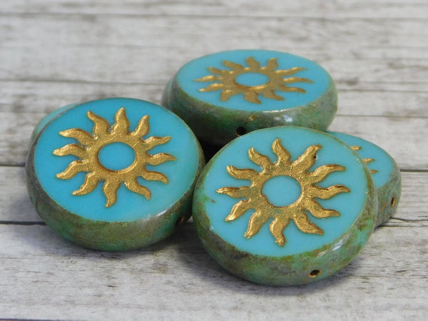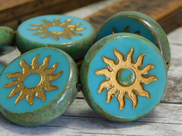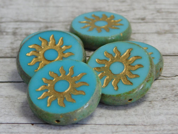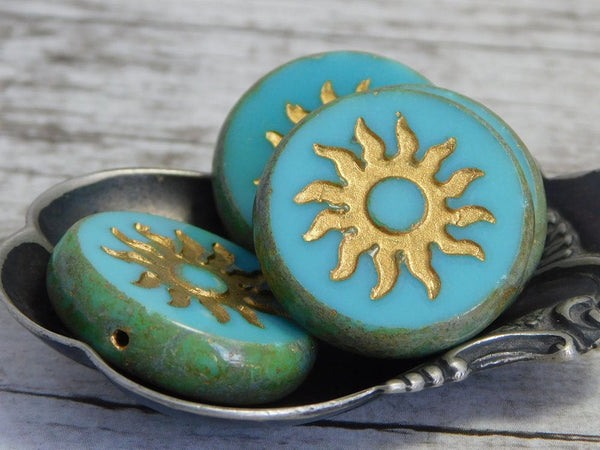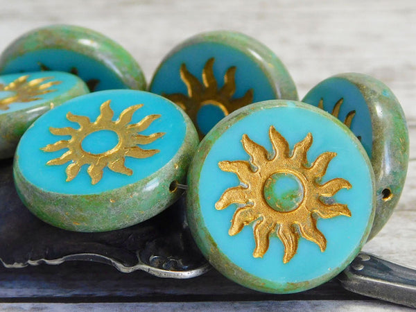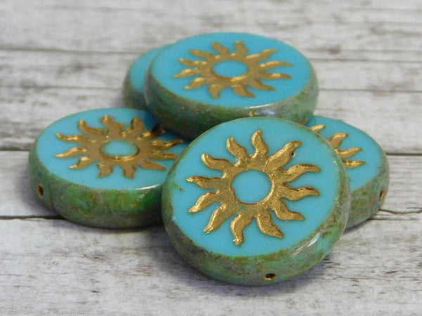 *2* 21mm Gold Washed Opaque Turquoise Picasso Table Cut Sun Design Coin Bead (LAST Pack)