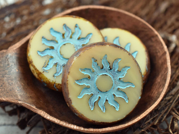 *2* 21mm Turquoise Washed Beige Picasso Table Cut Sun Design Coin Beads