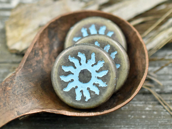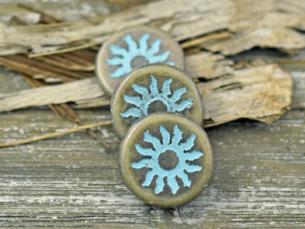 *2* 21mm Turquoise Washed Bronzed Beige Sun Design Coin Beads