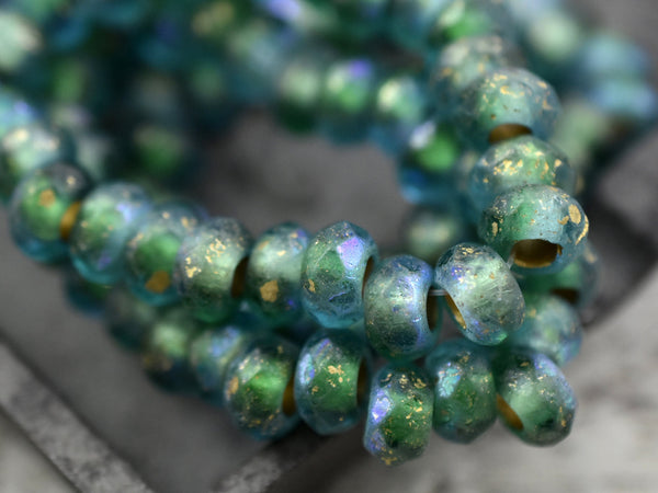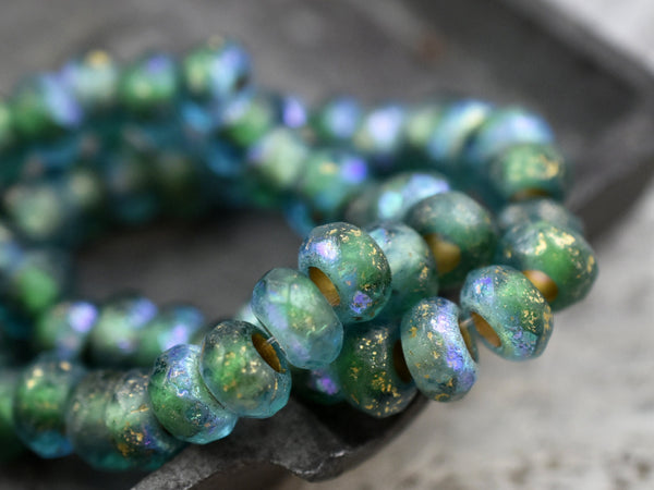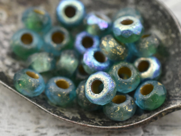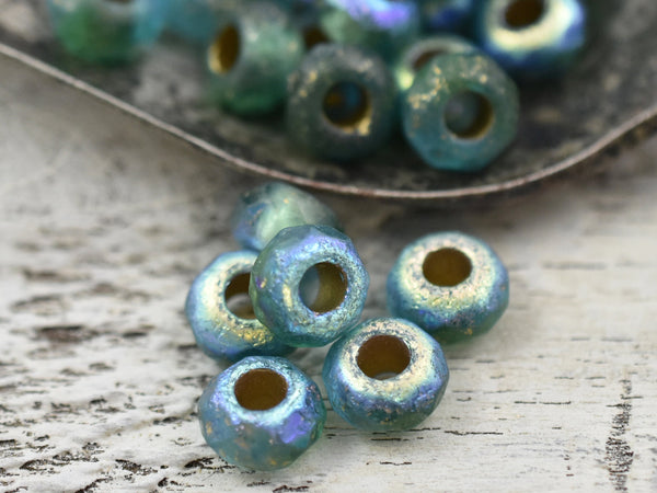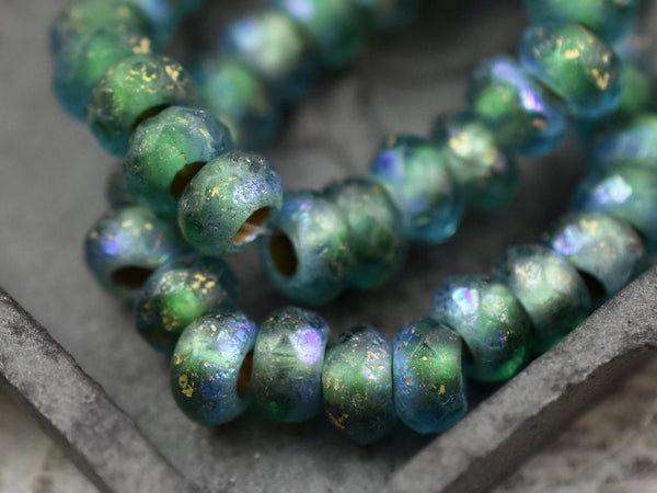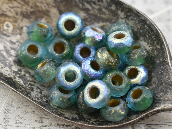 *25* 5x8mm Gold Washed Etched Blue Green AB Large Hole Roller Rondelle Beads