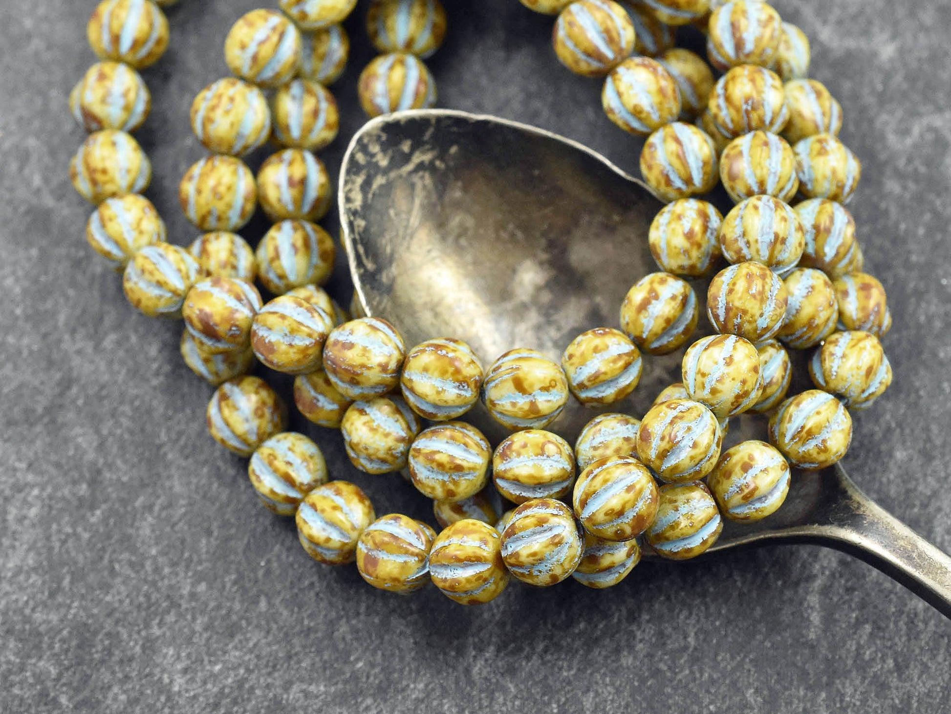 *25* 6mm Turquoise Washed Opaque Beige Picasso Fluted Round Melon Beads