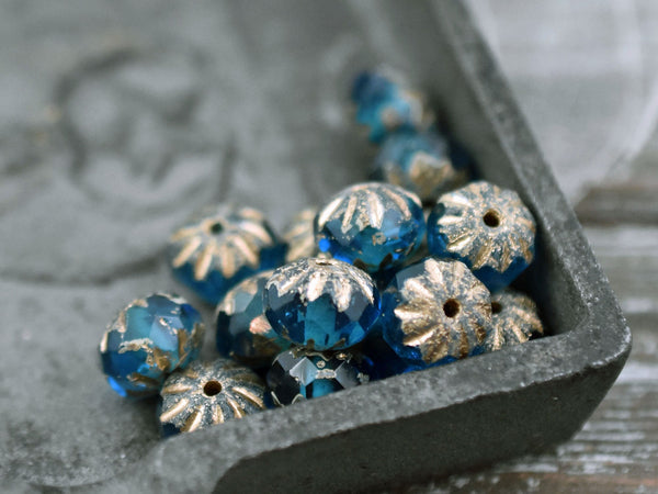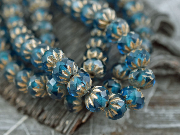 *25* 6x9mm Etched Gold Washed Pacific Blue Cruller Rondelle Beads