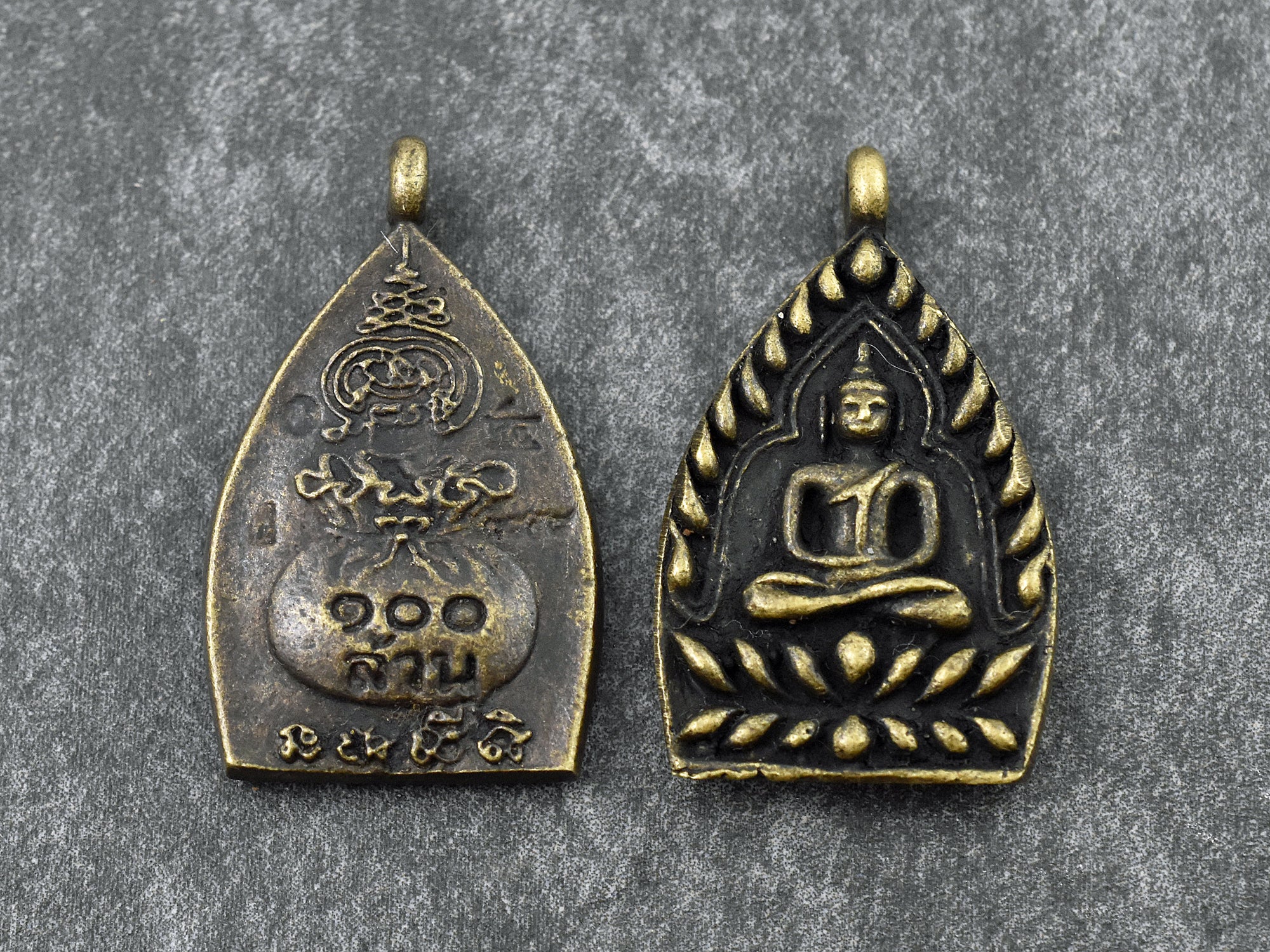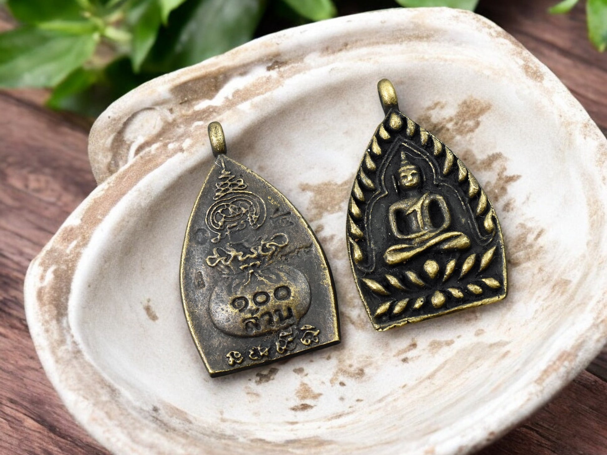 Thai amulets are either made by or blessed by Thai monks and are highly revered in Thailand. They are worn for protection and good luck. These are a handmade item and therefore each pendant will slightly vary.