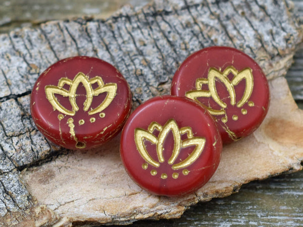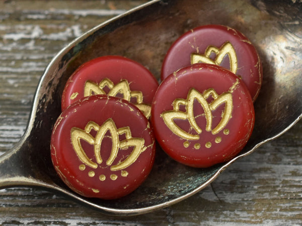 *4* 14mm Gold Washed Matte Red Opaline Lotus Flower Coin Beads