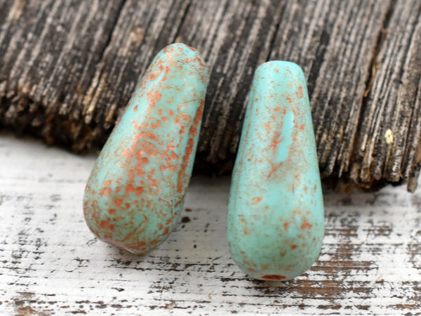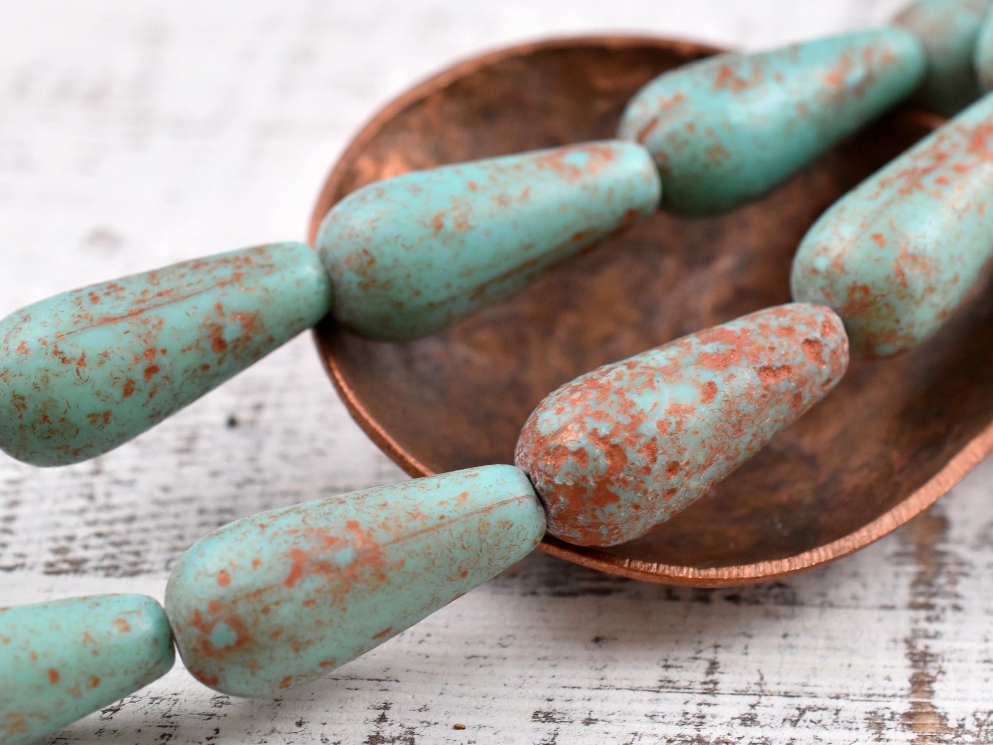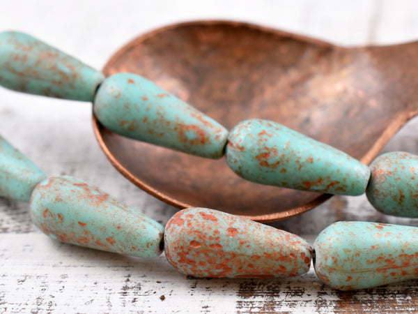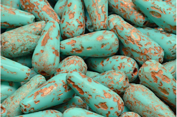*4* 9x20mm Etched Matte Copper Washed Turquoise Teardrop Beads