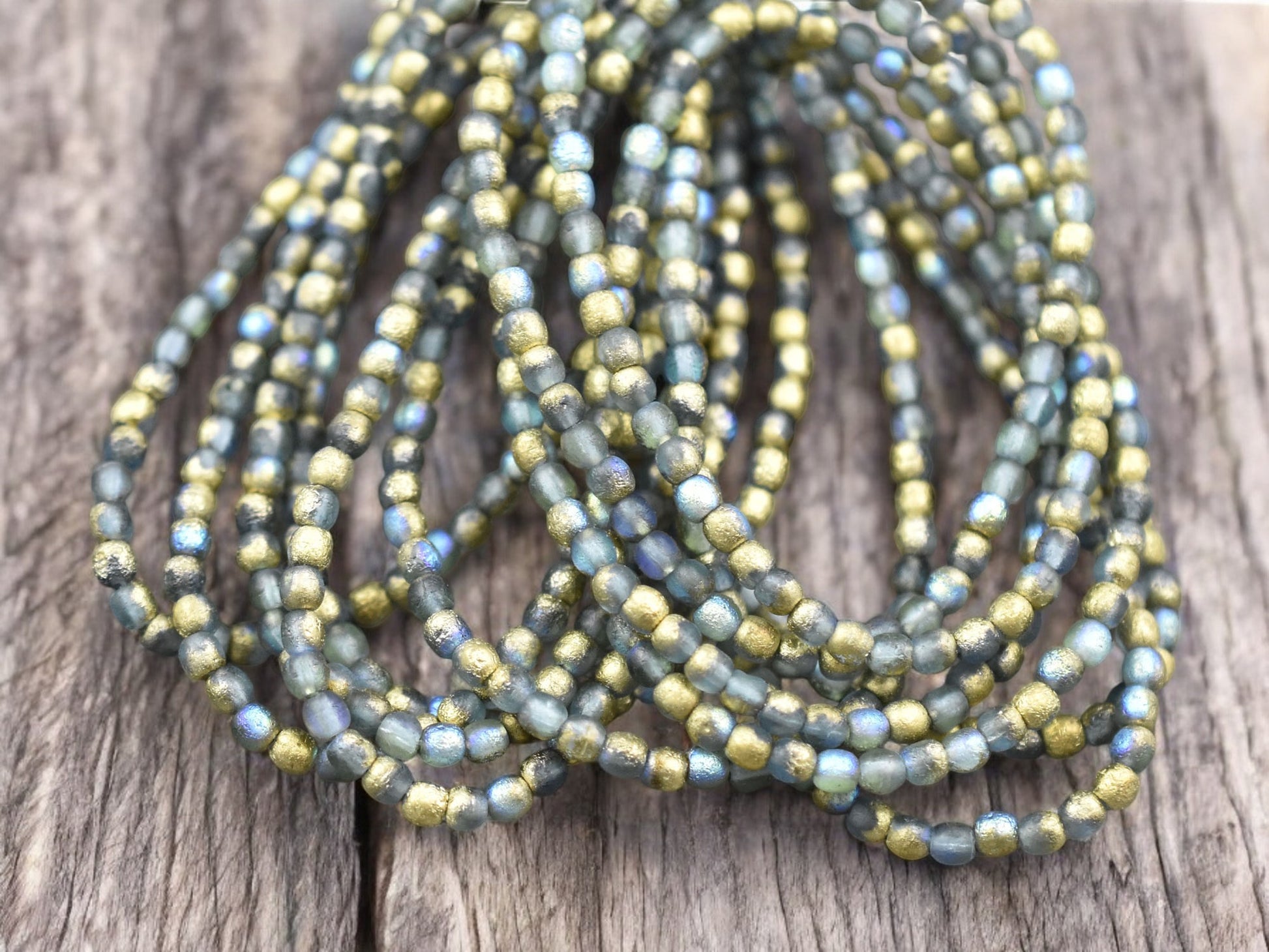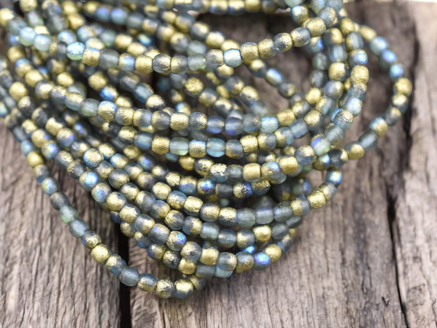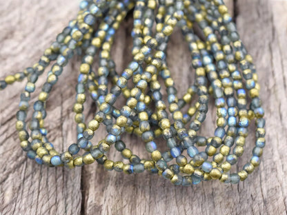 *50* 3mm Gold Washed Etched Montana Blue AB Round Druk Beads