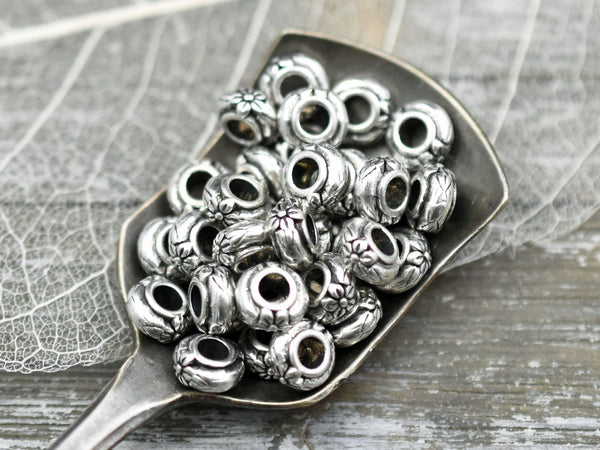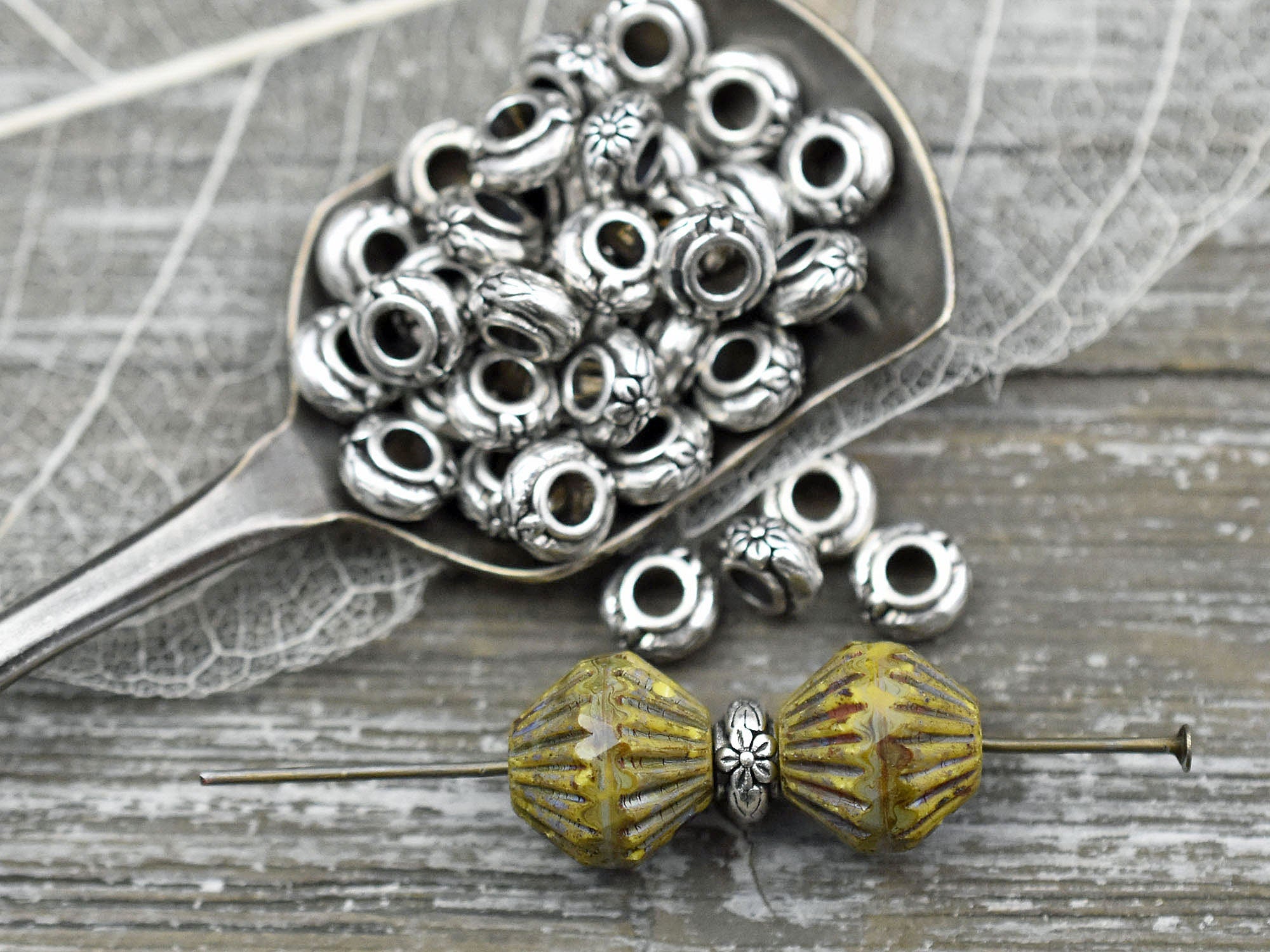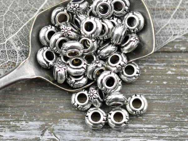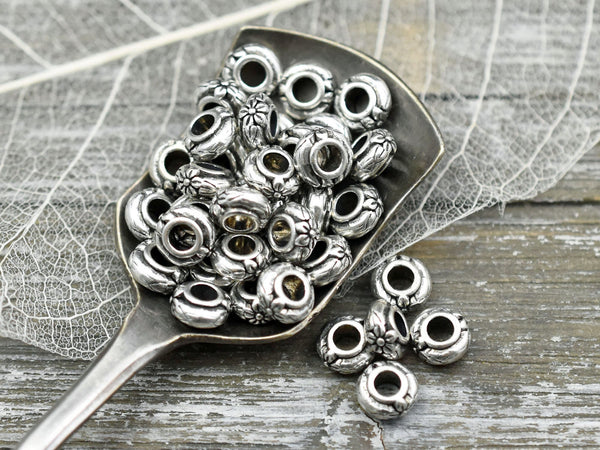 *50 6x4mm Antique Silver Large Hole Floral Rondelle Spacer Beads