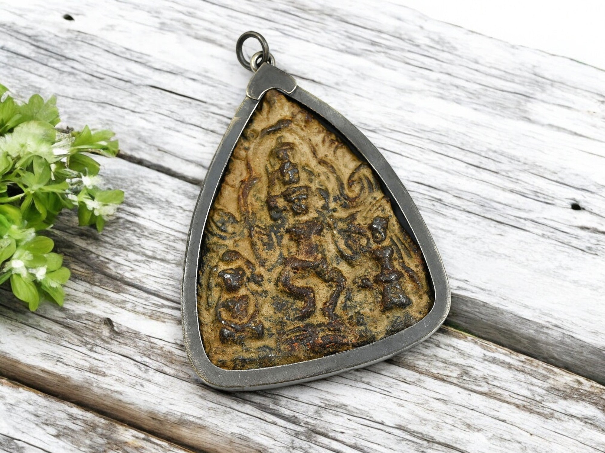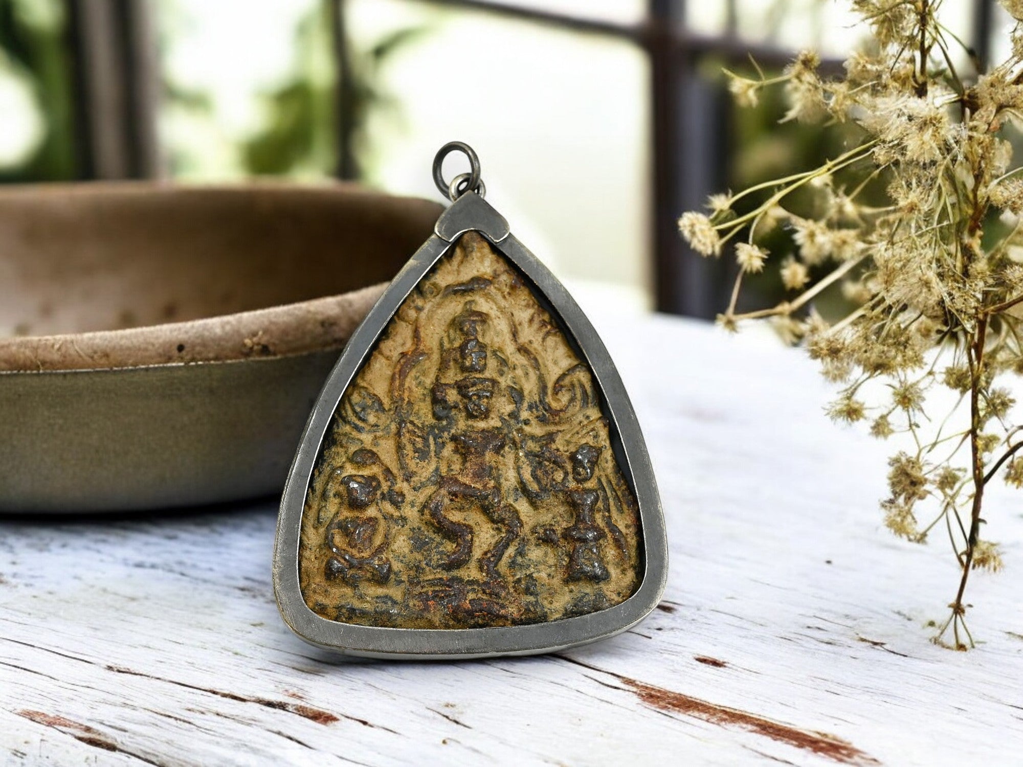 Thai amulets are either made by or blessed by Thai monks and are highly revered in Thailand. They are worn for protection and good luck. These are a handmade item and therefore each pendant will slightly vary.