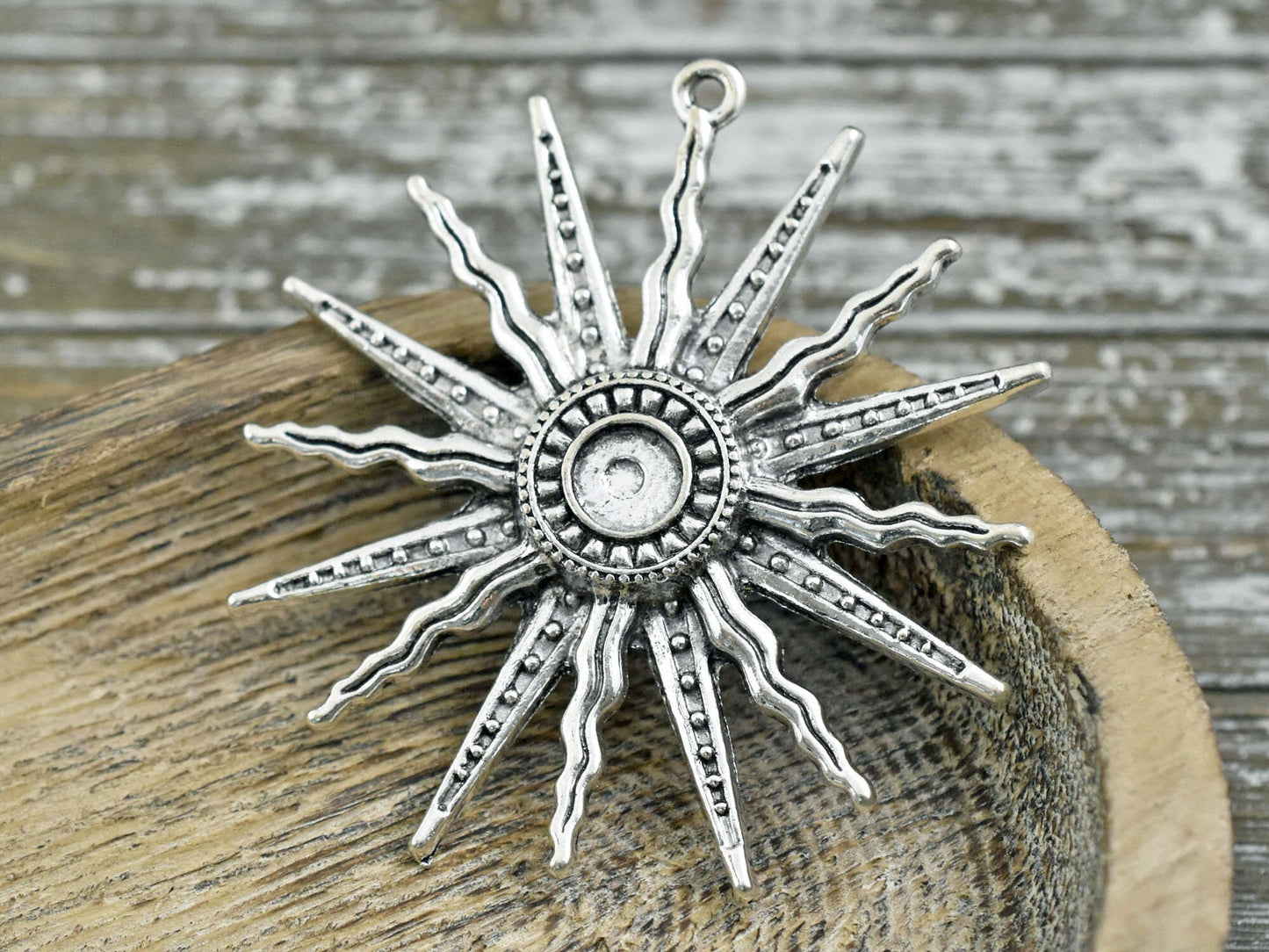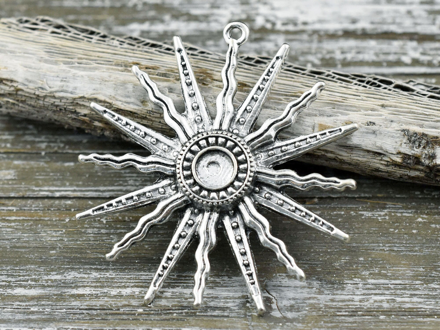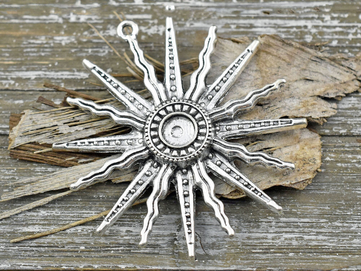 Type/Shape: Large medallion style sun pendant -- Center of sun will accomodate 7-8mm bead or cabochon