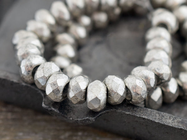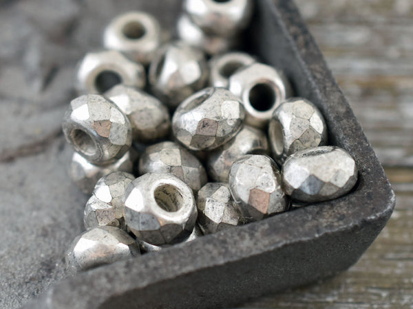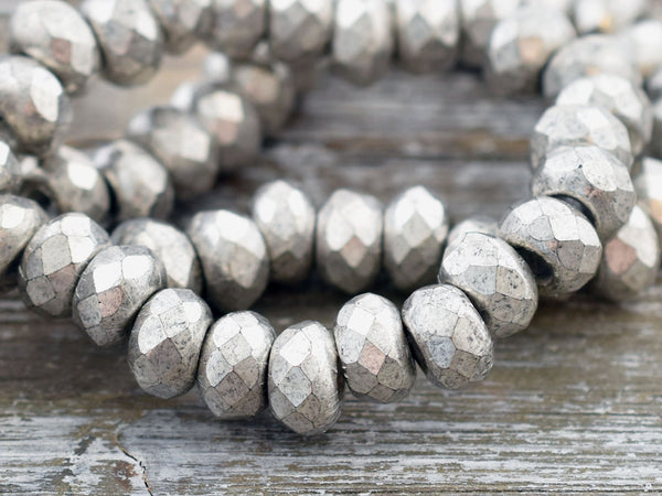 These 5x8mm silver faceted rondelle beads are crafted with high-quality Czech glass. The large hole accommodates a wide range of stringing materials, making them perfect for jewelry-making projects. Get creative and choose your desired quantity today.