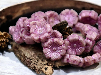 *12* 12mm Gold Lustered Metallic Pink Etched Pink Hawaiian Flower Beads