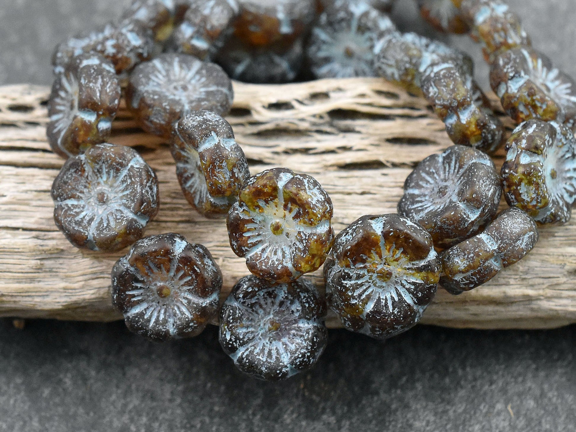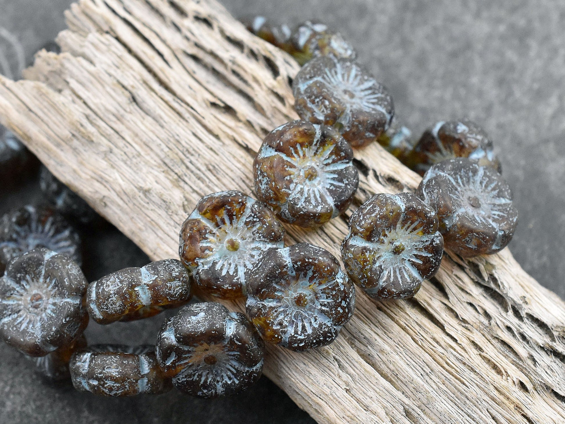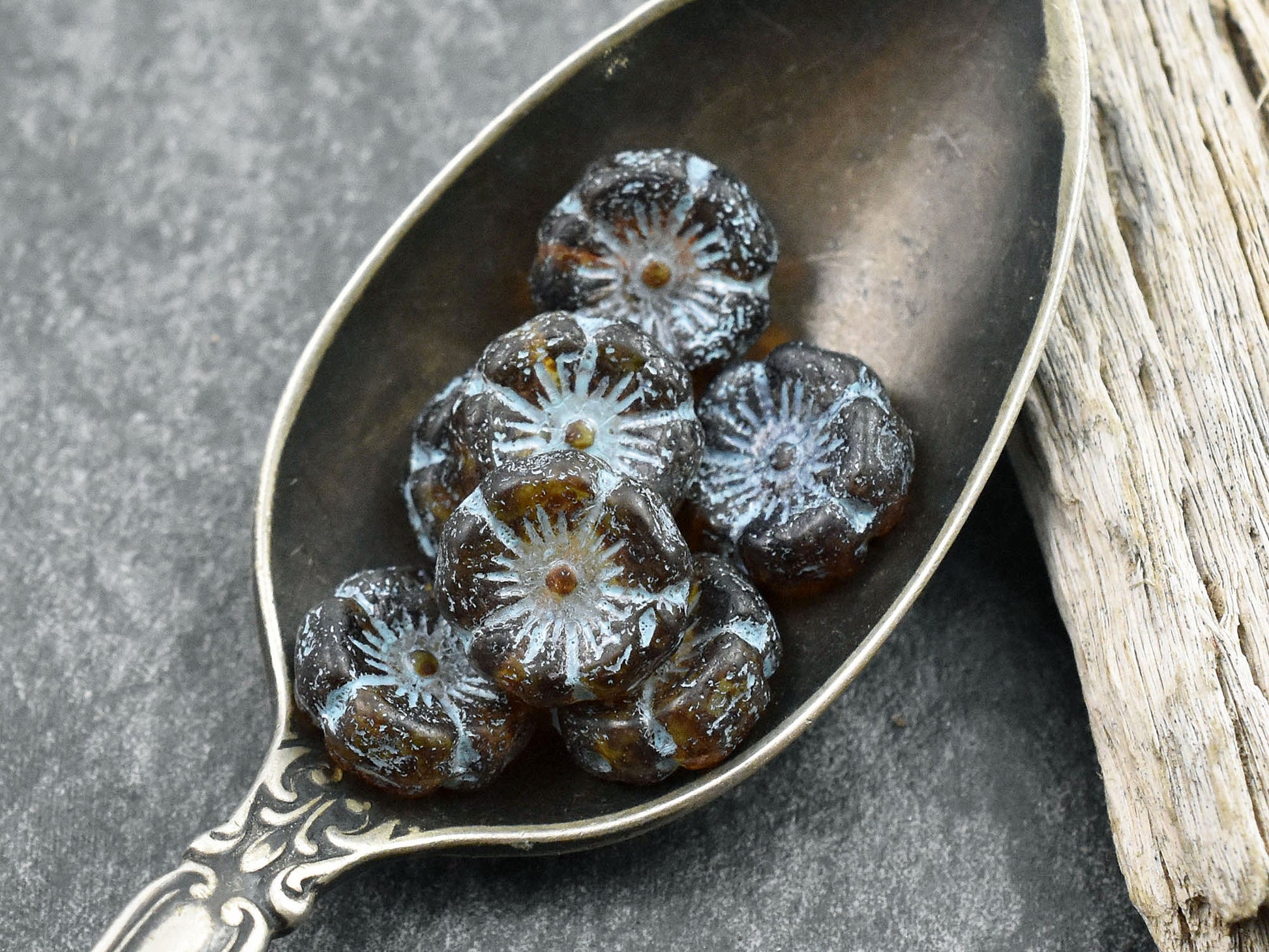 *12* 12mm Turquoise Washed Etched Matte Amber Hawaiian Flower Beads