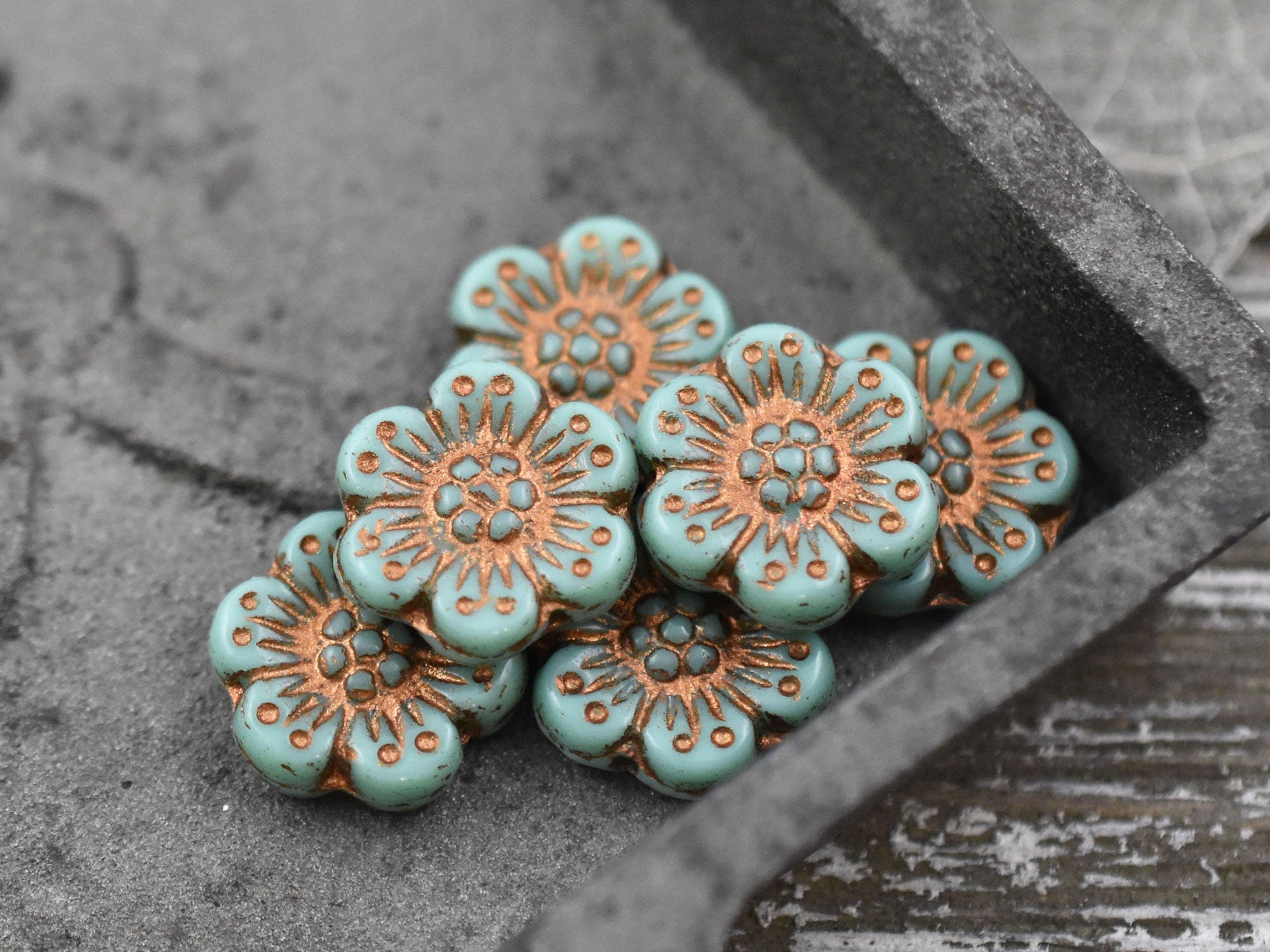 *6* 14mm Copper Washed Opaque Turquoise Wildflower Beads
