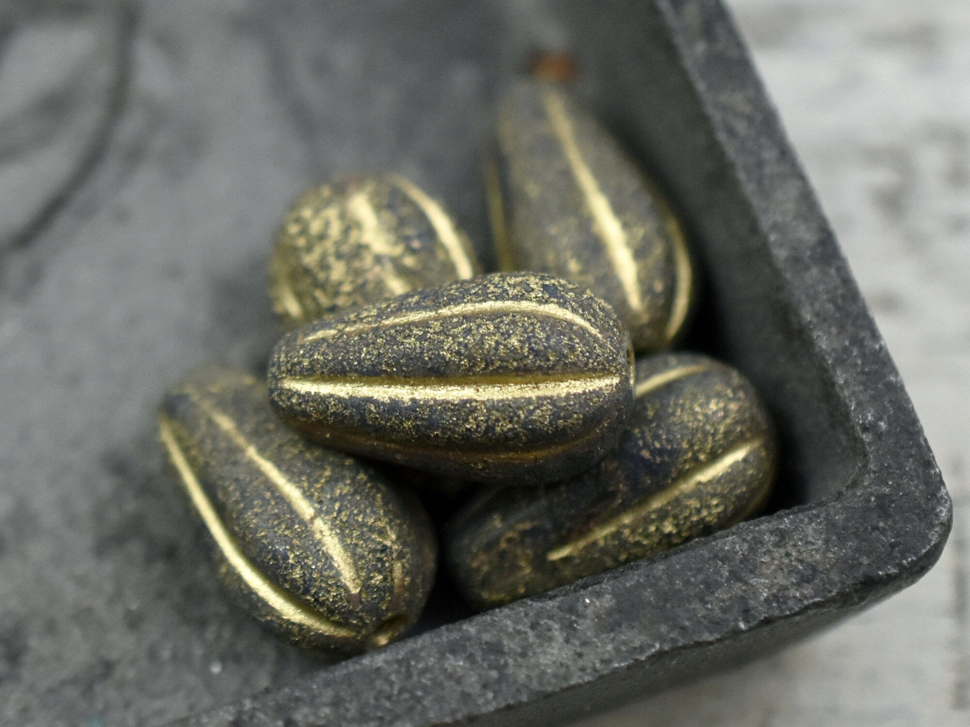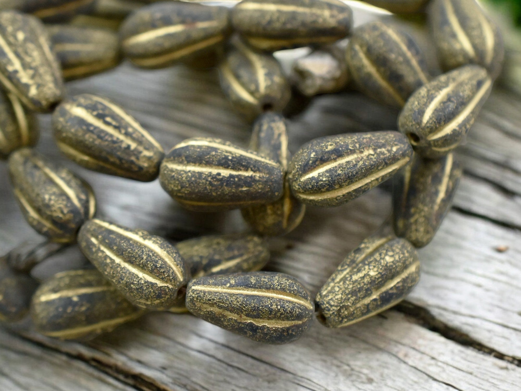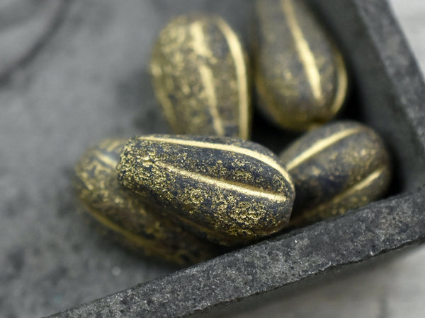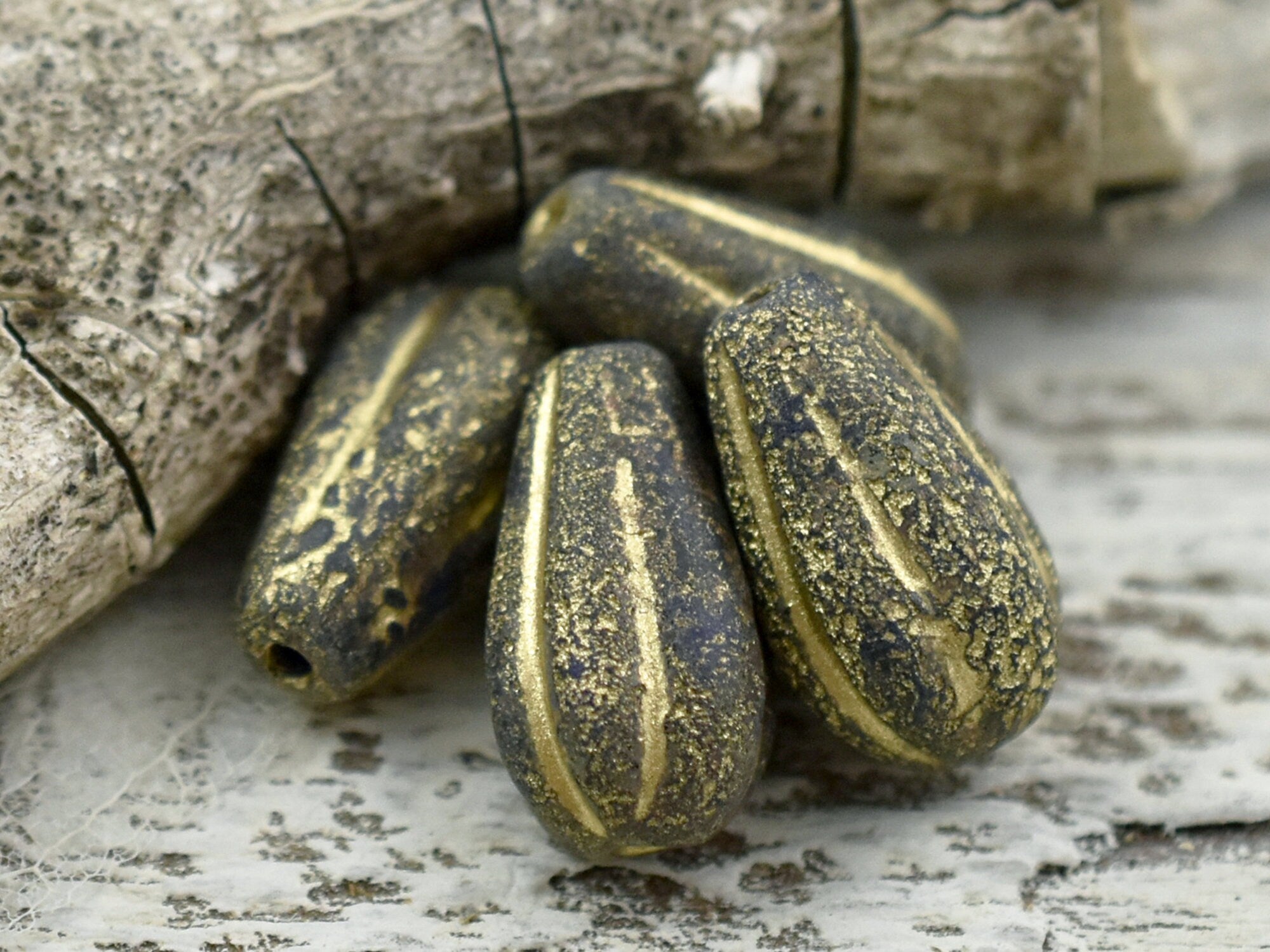 *10* 15x8mm Etched Gold Washed Indigo Picasso Melon Drop Beads
