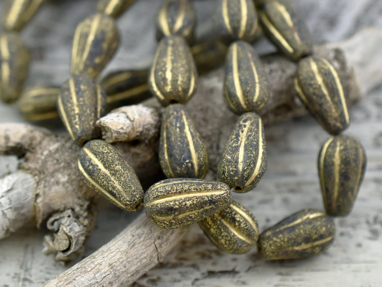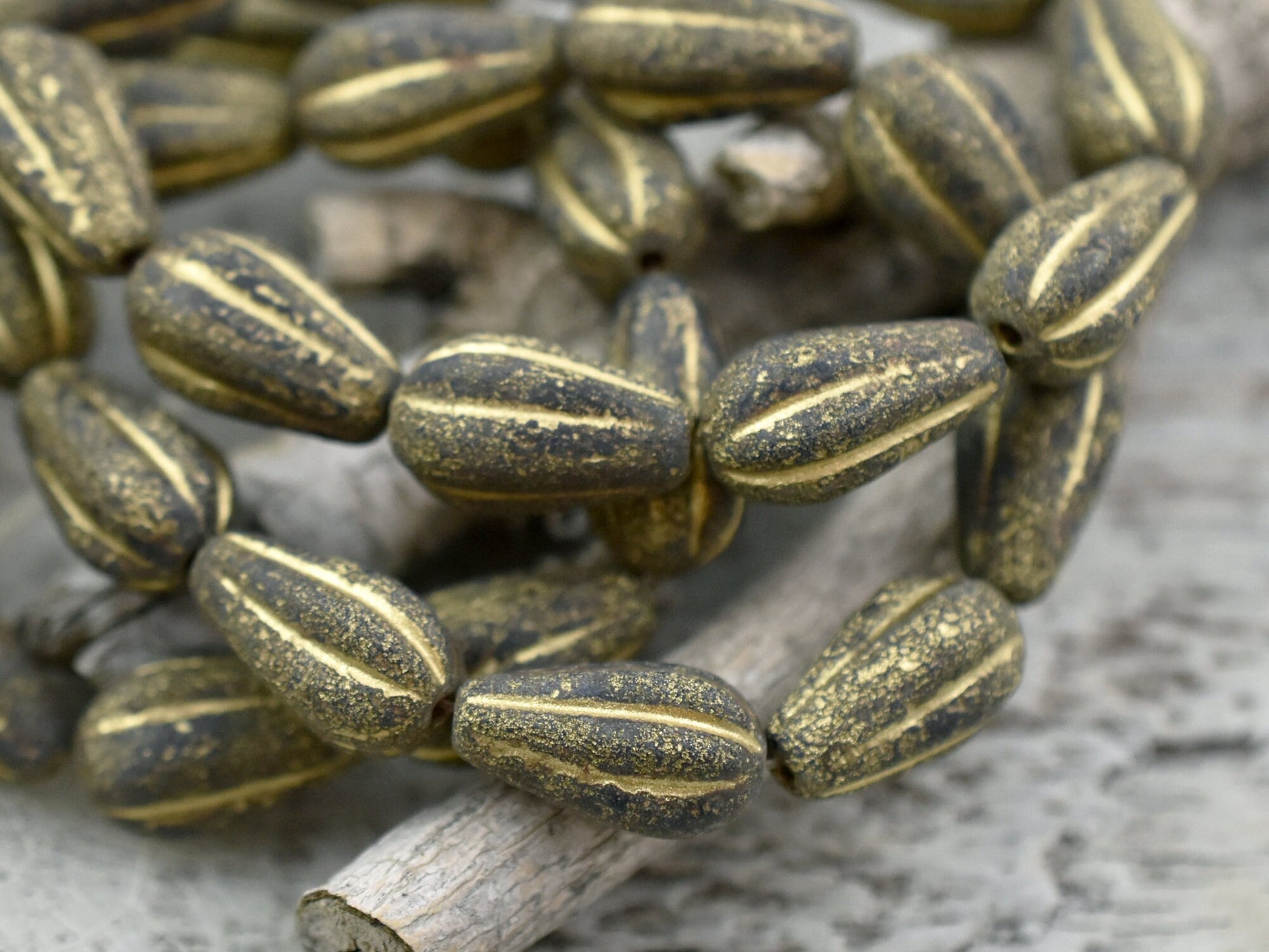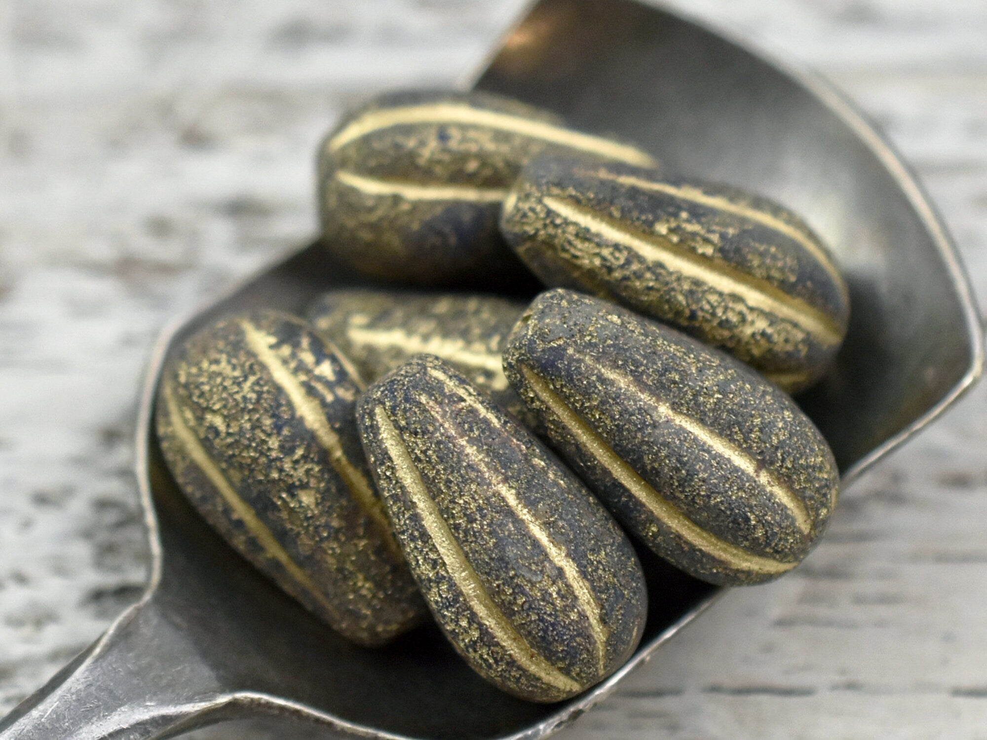 *10* 15x8mm Etched Gold Washed Indigo Picasso Melon Drop Beads