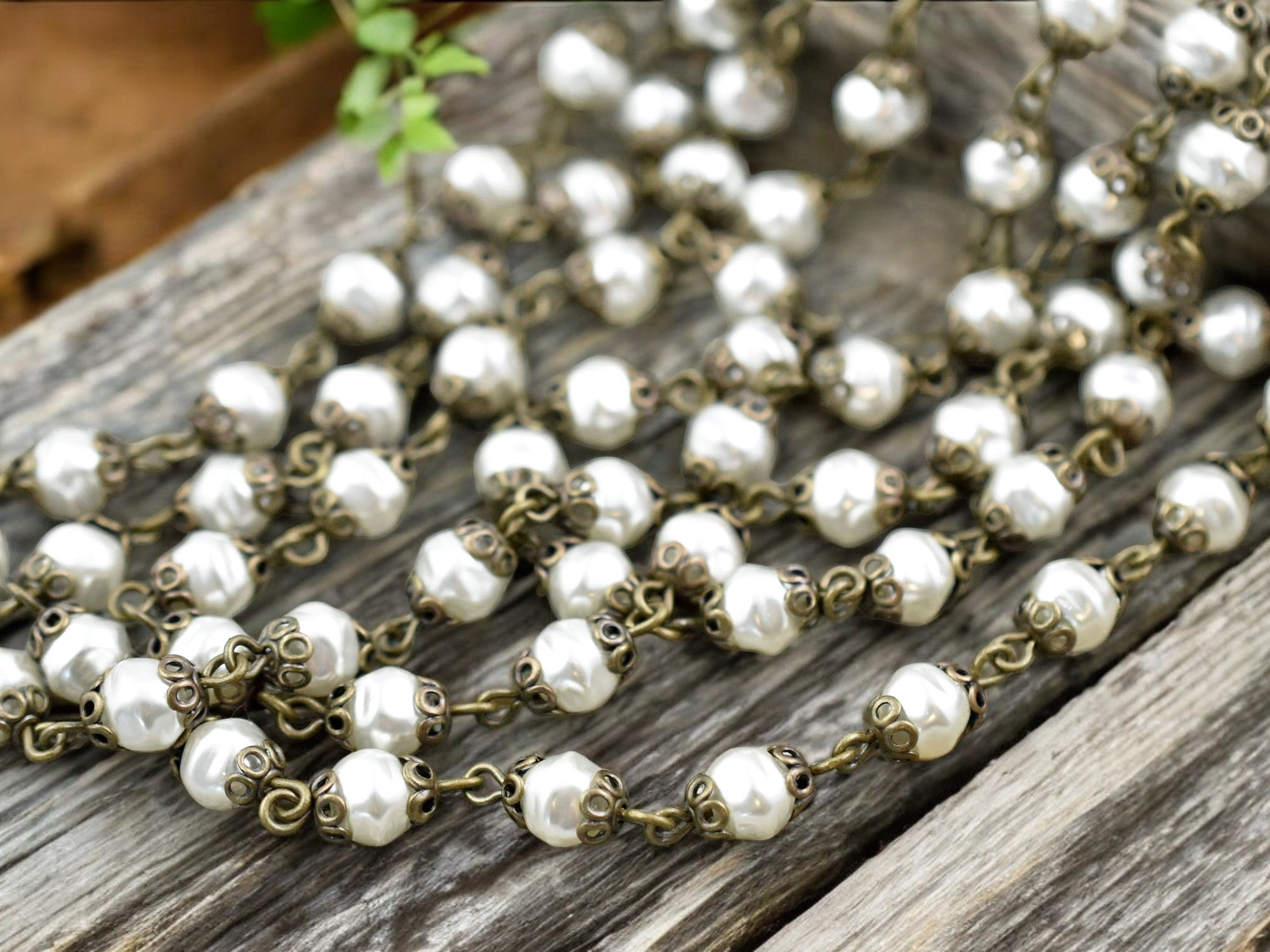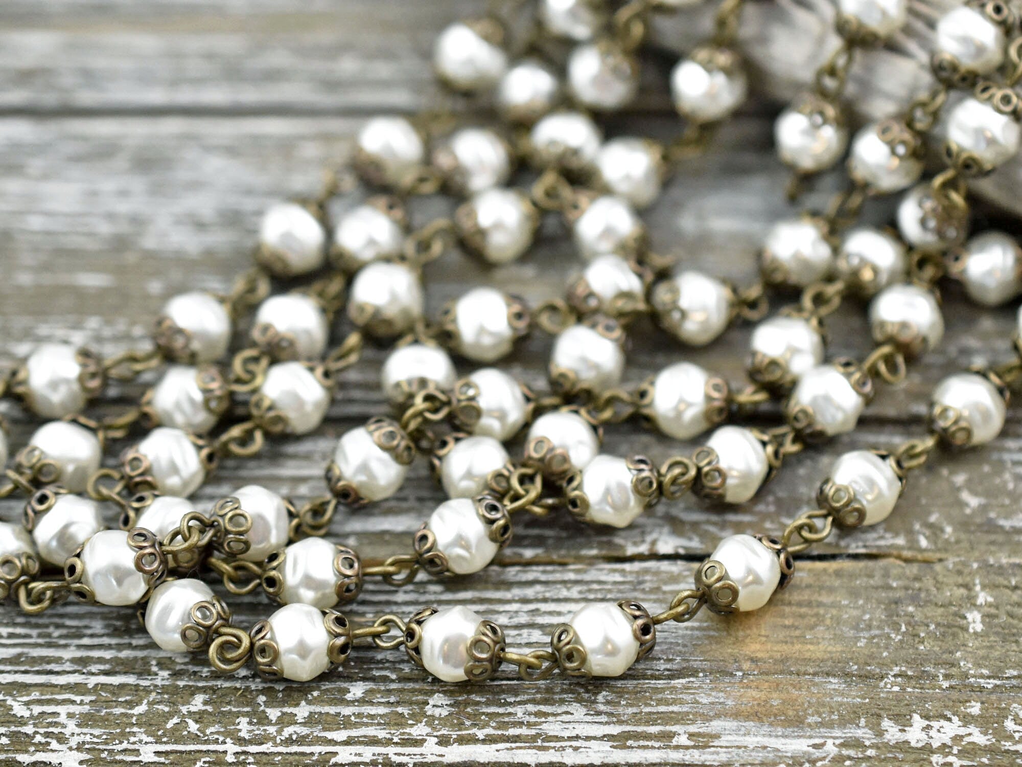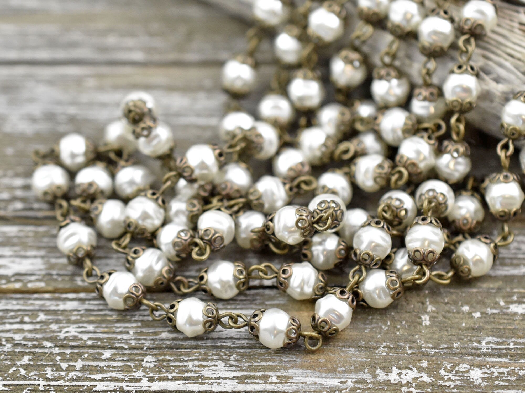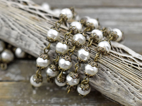 6mm Czech Glass White Pearl Chain with Bronze Caps -- Sold by the foot