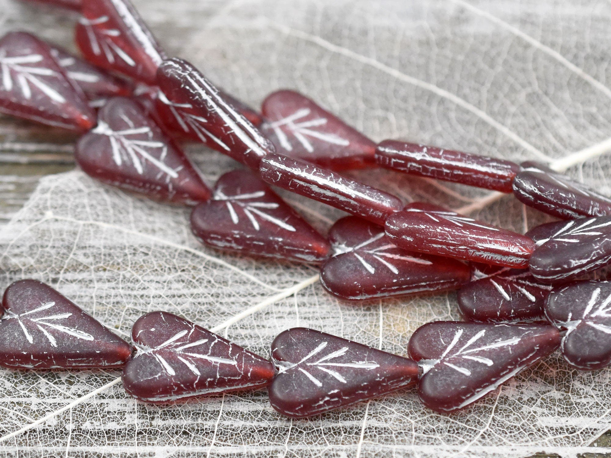 *8* 17x11mm Silver Washed Ruby Red Heart Leaf Beads