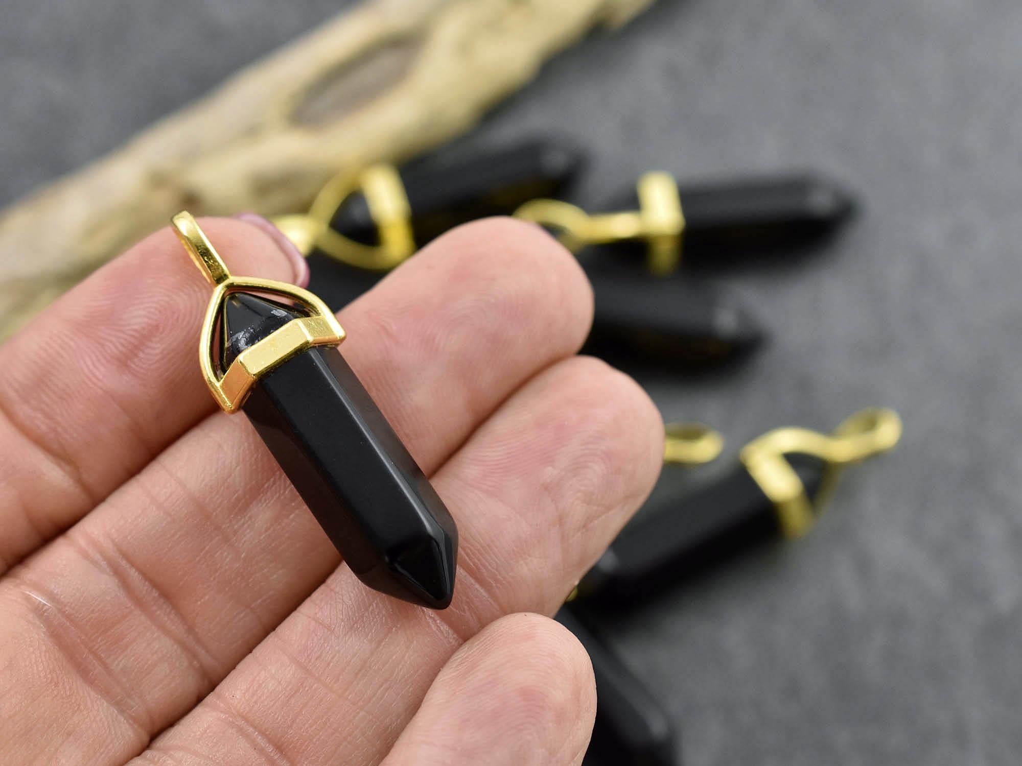 40mm Gold Tone Natural Black Obsidian Double Terminated Bullet Pendant