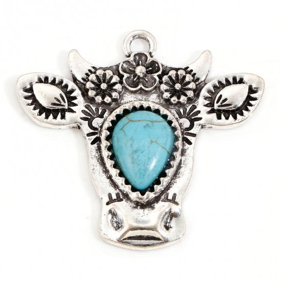 *5* 41x38mm Antique Silver w/Turquoise Boho Floral Cow Head Pendants