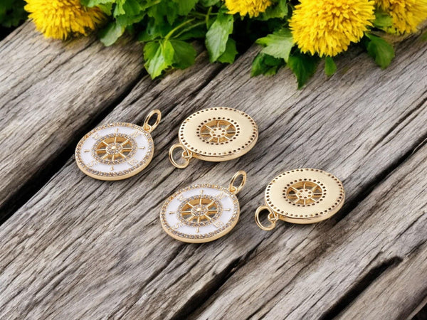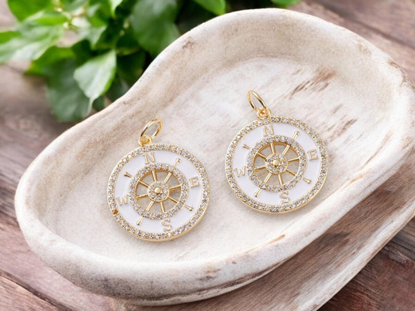 22x20mm 18k Gold Plated Brass Micro Pave Cubic Zirconia w/Enamel Compass Charm