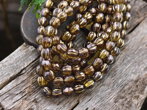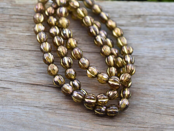 *25* 6mm Gold Washed Green Olive Luster Faceted Round Melon Beads