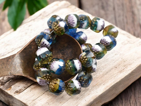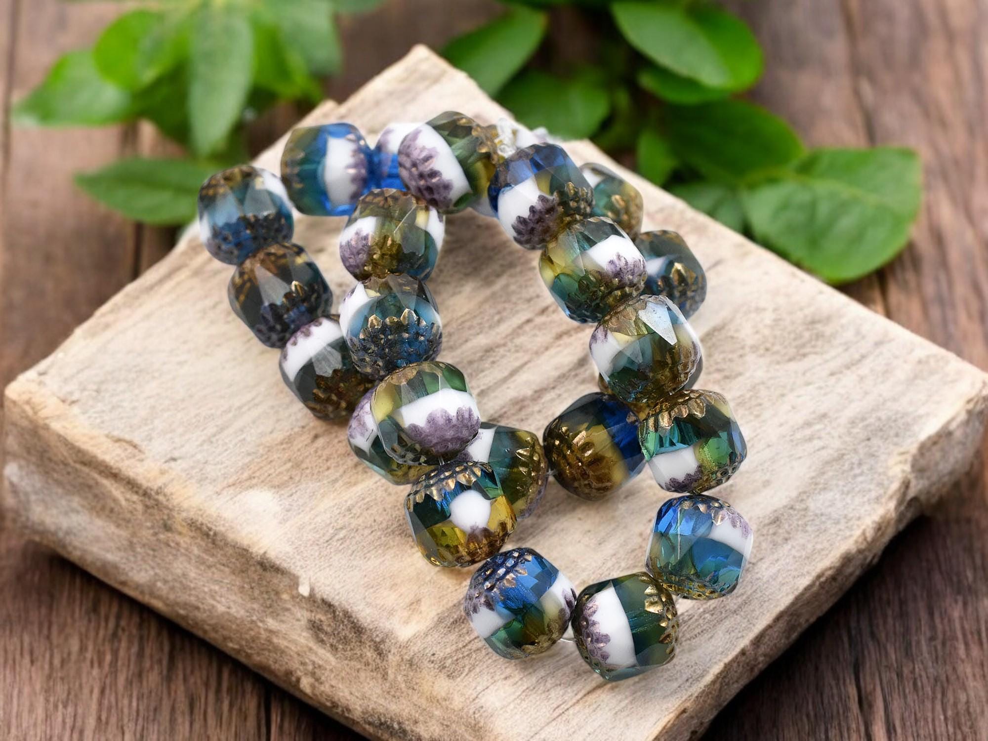 *12* 10mm Gold Washed Blended Pacific Blue, White & Topaz Fire Polished Cathedral Beads