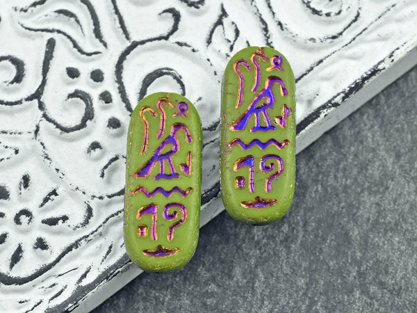 *6* 25x10mm Matte Olive Green Rainbow Metallic Egyptian Cartouche Oval Beads
