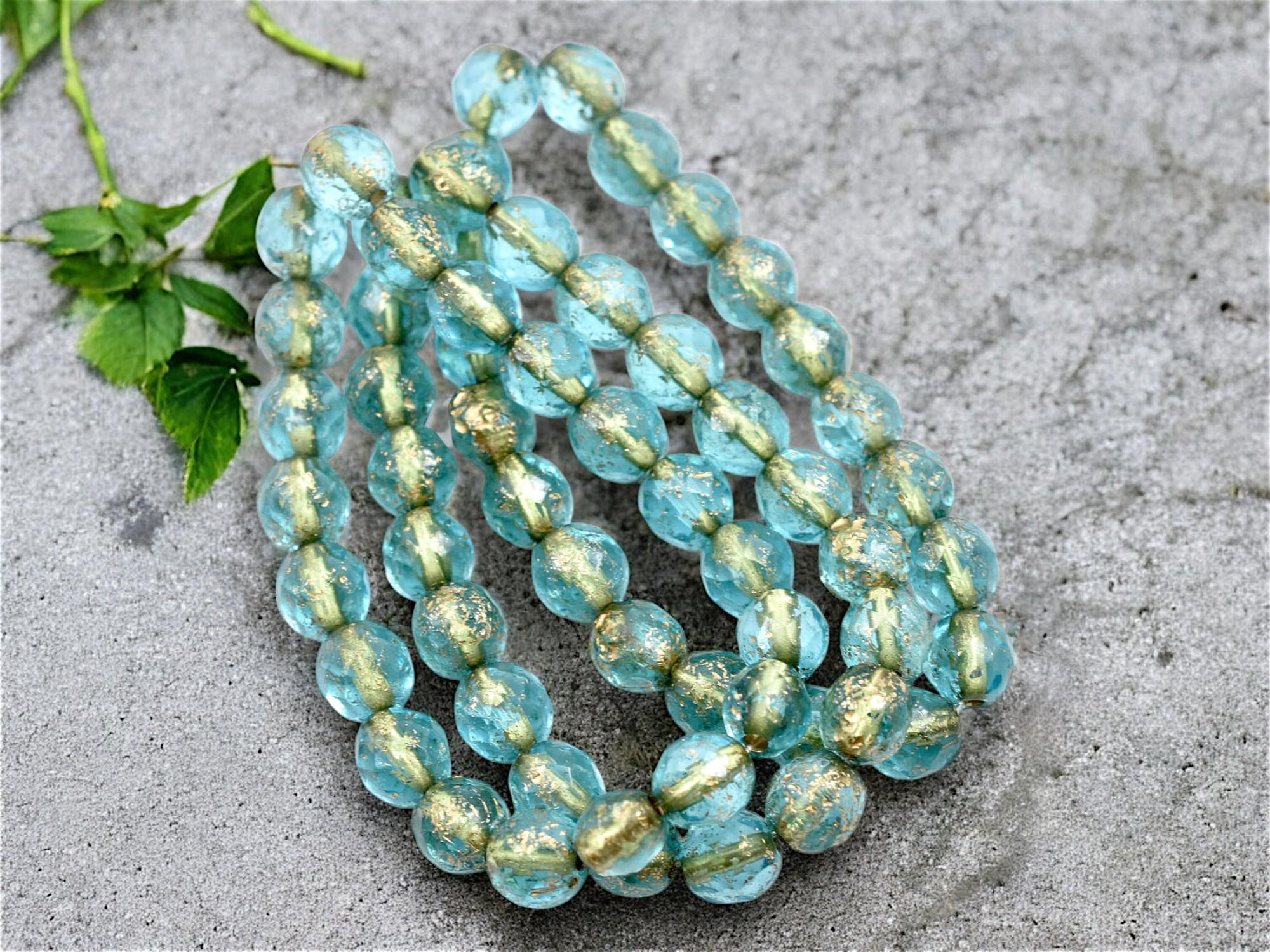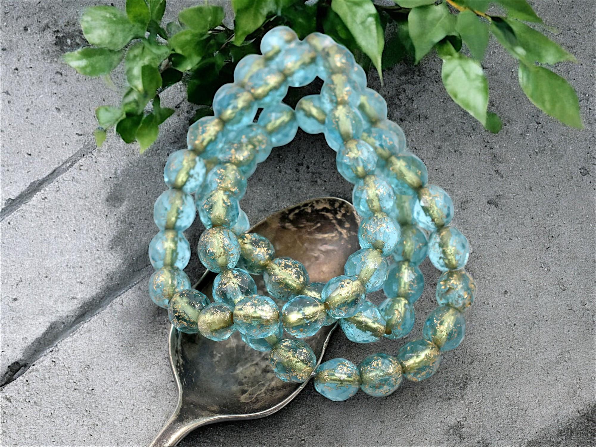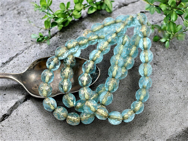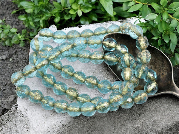*20* 8mm Gold Washed Etched Blue Aqua Fire Polished Round Beads