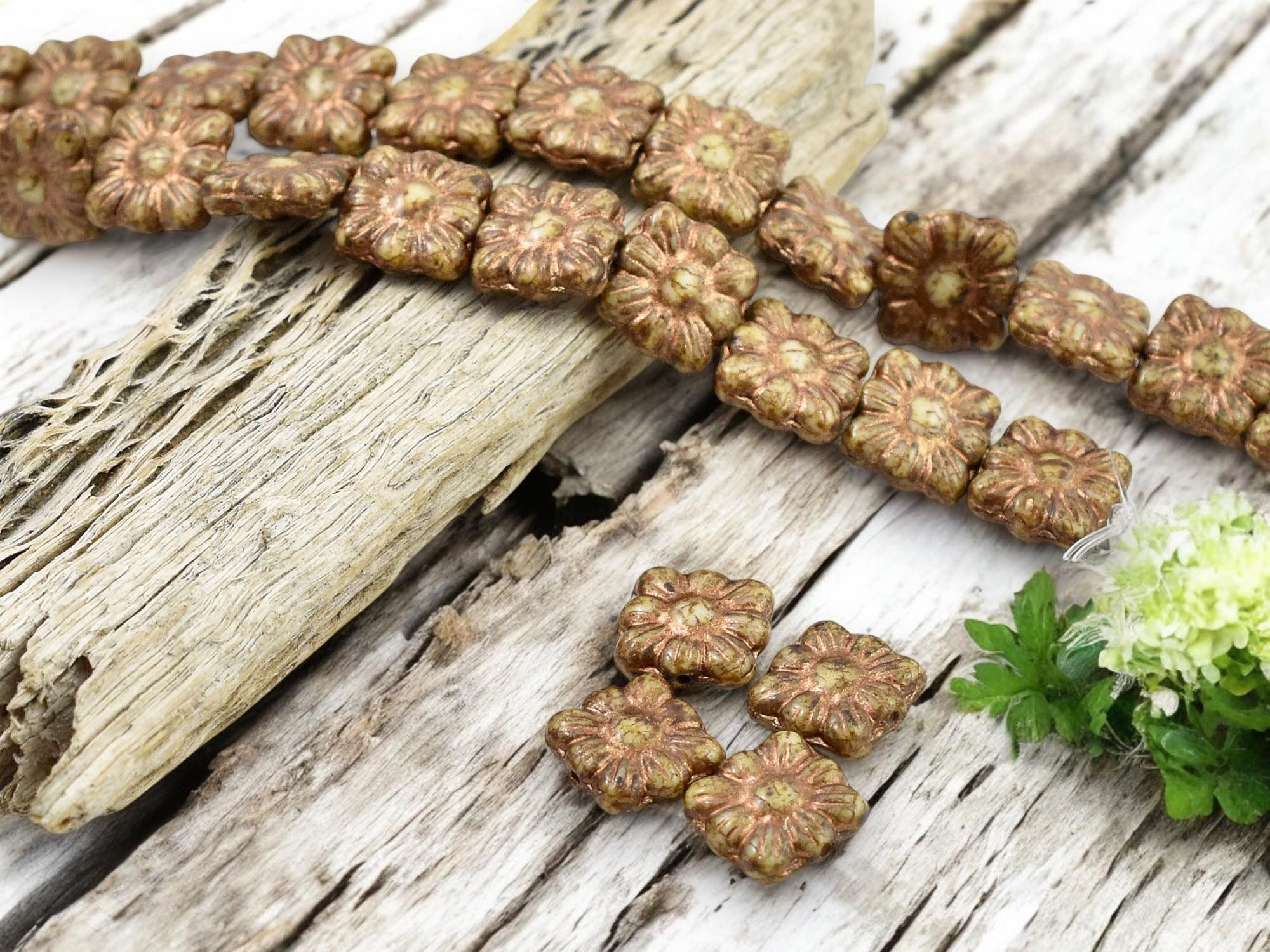 *13* 11mm Bronze Washed Ivory Travertine Square Zinnia Flower Beads