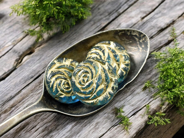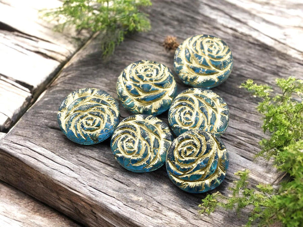 *6* 18mm Bronze Washed Aqua Rose Flower Coin Beads
