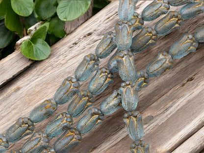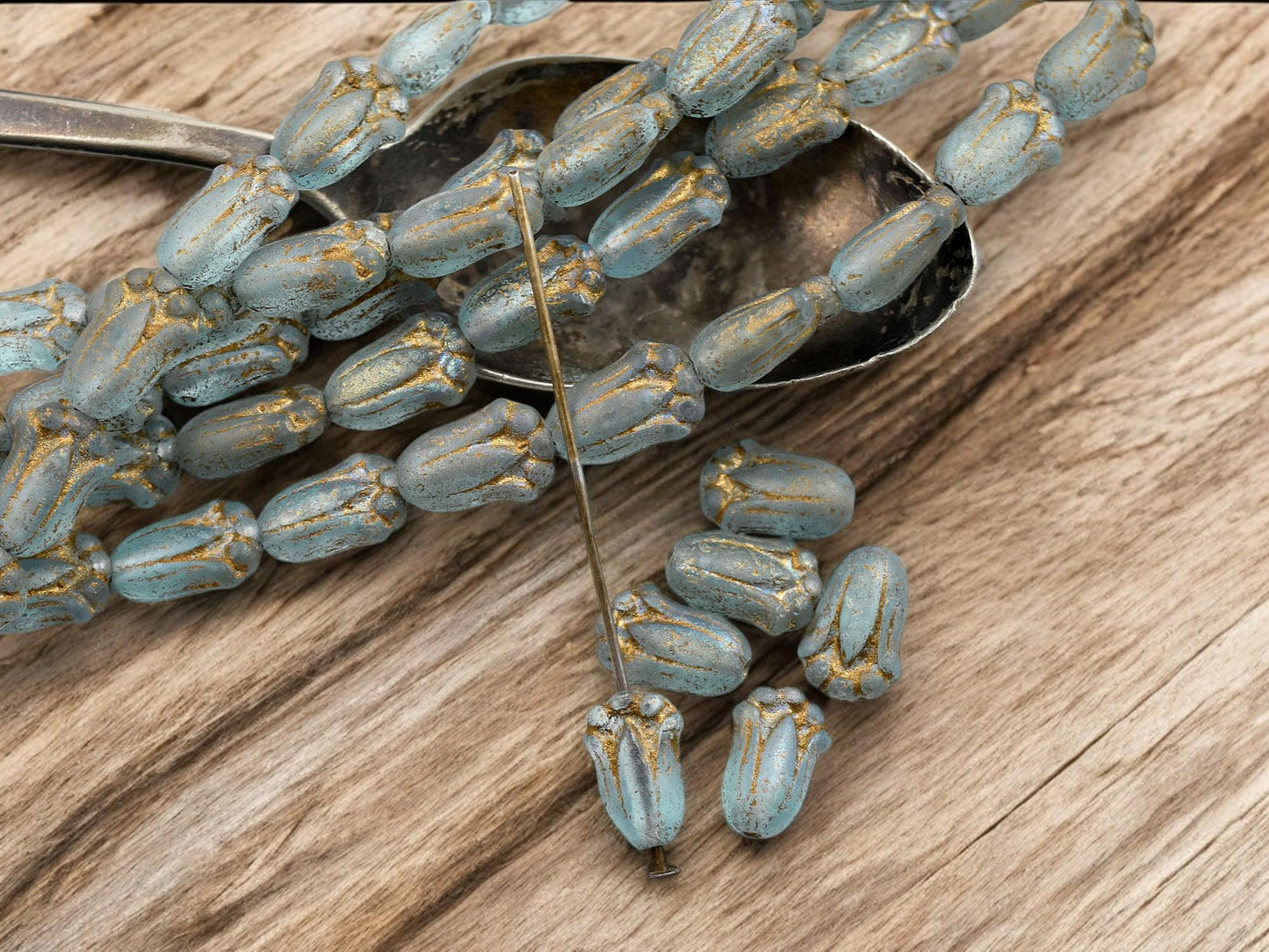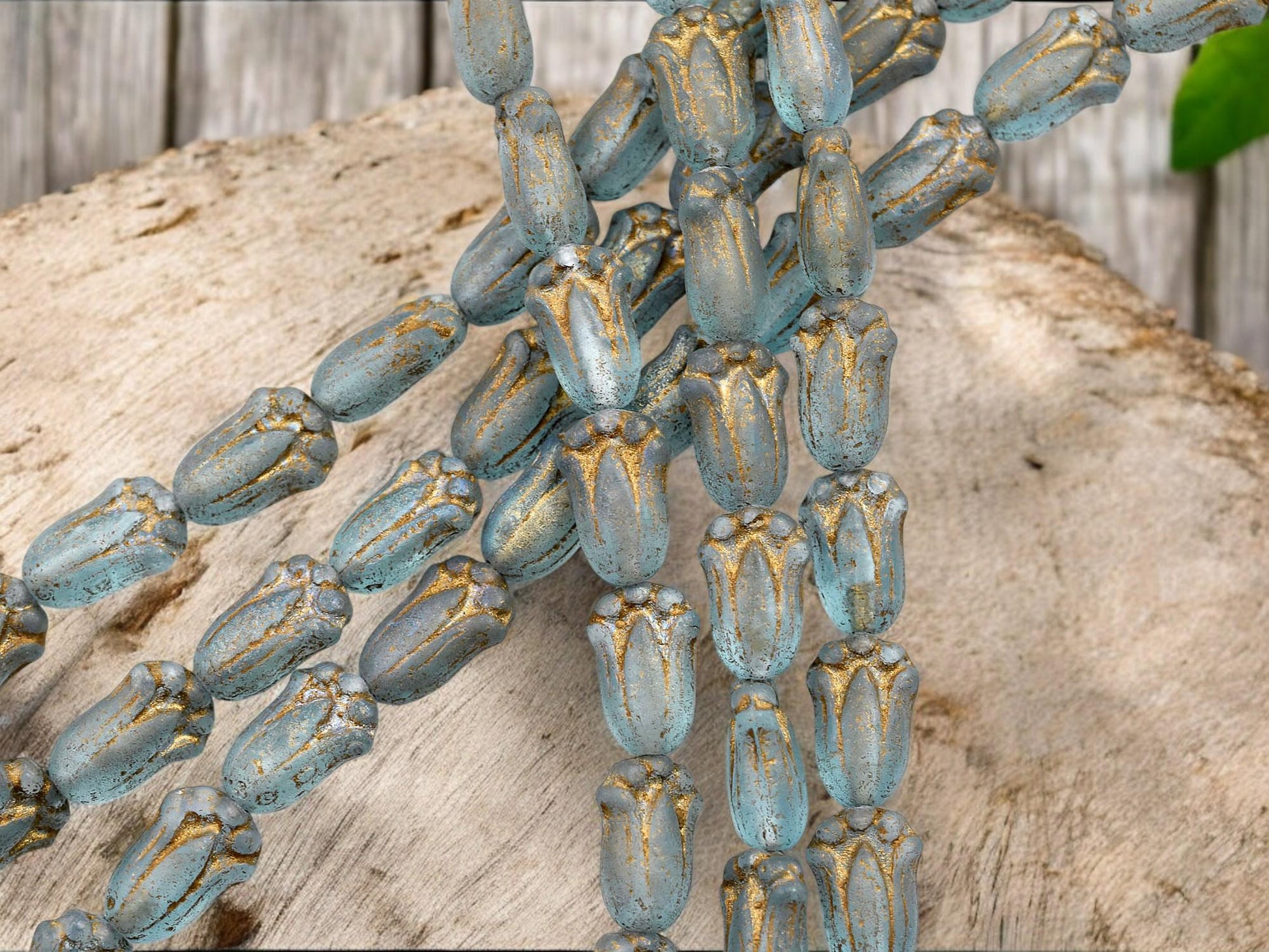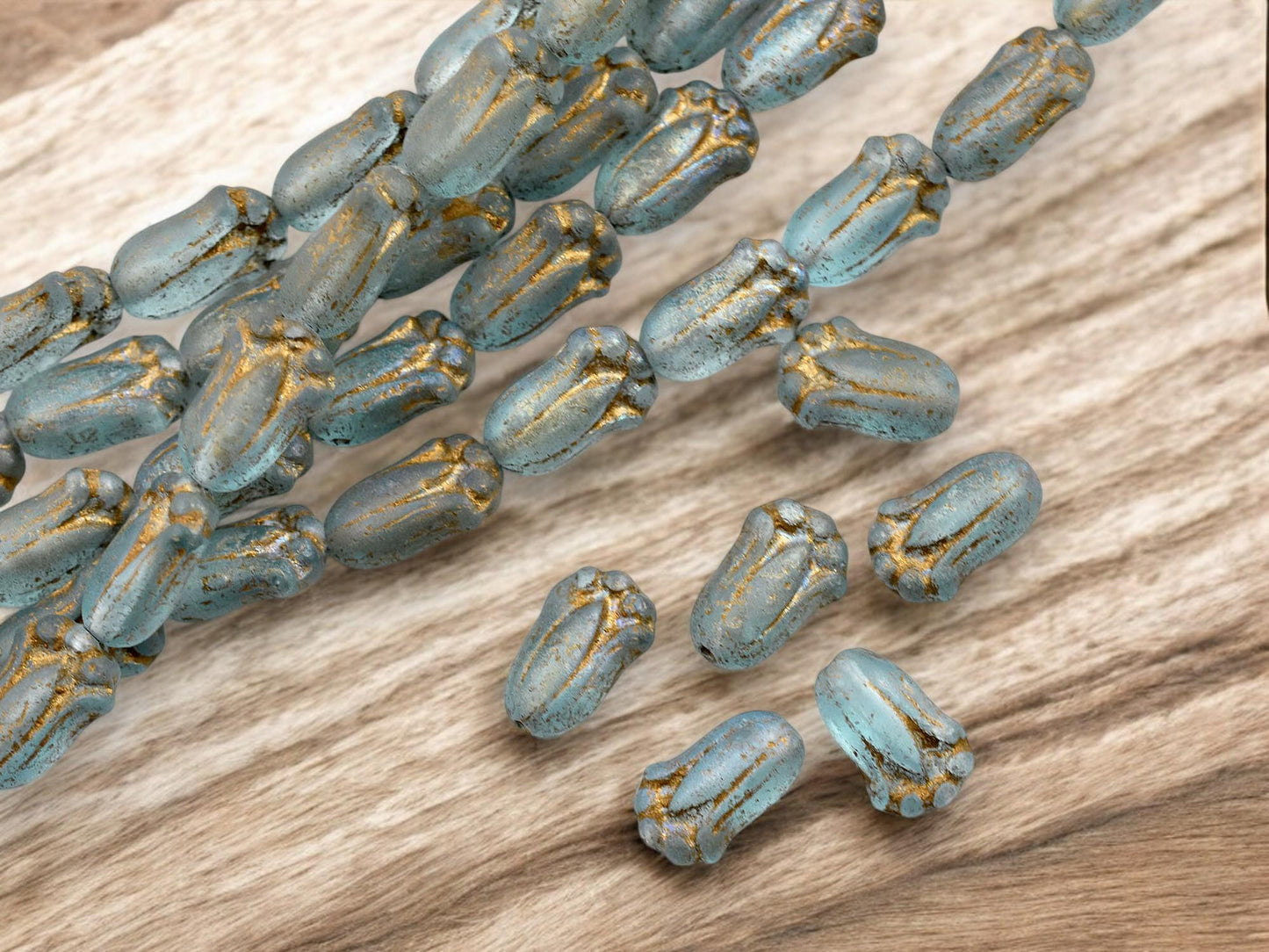 *12* 12x8mm Gold Washed Etched Blue Aqua Tulip Beads