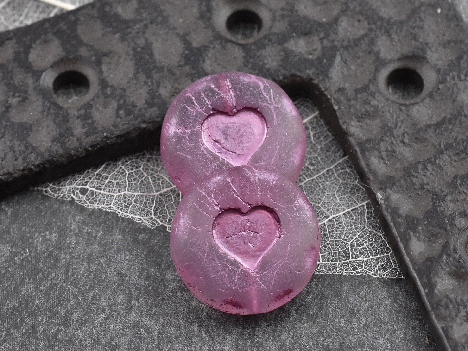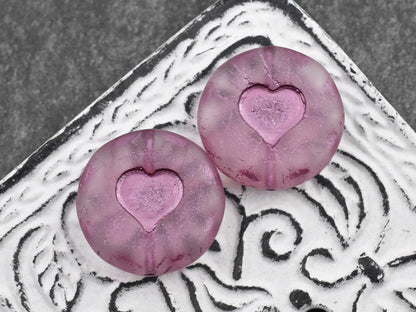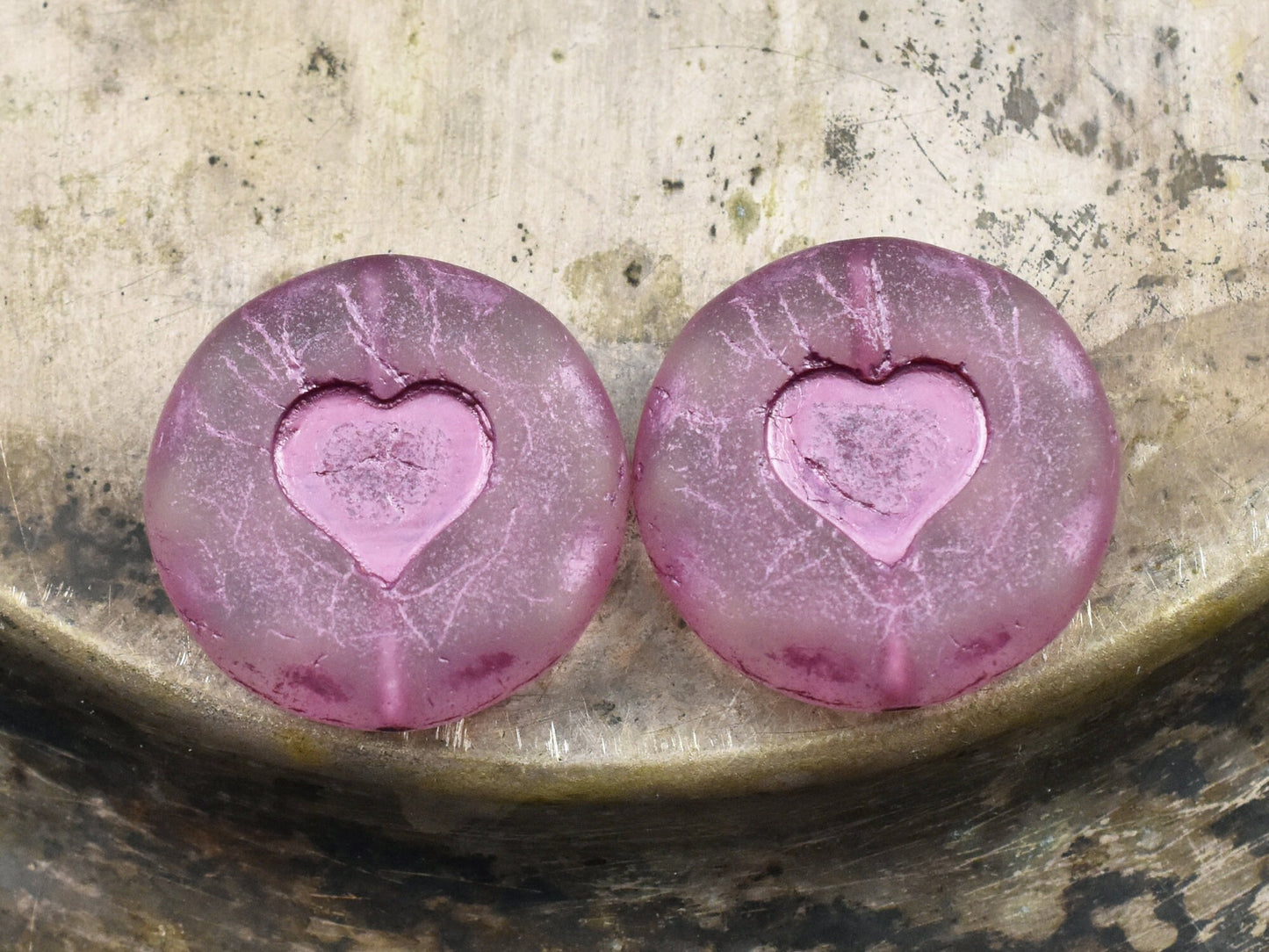 *2* 21mm Metallic Pink Washed Matte Crystal Heart Coin Beads