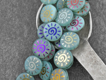 *8* 14mm Aqua Opaline Satin Sliperit Laser Tattoo Sun Coin Beads