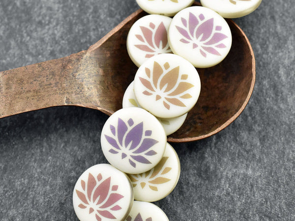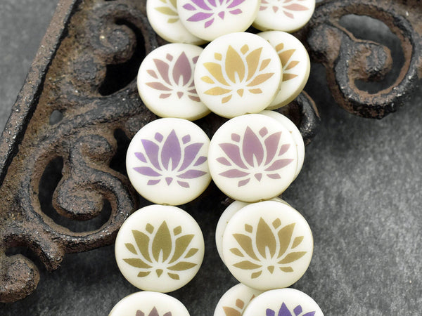 *8* 17mm Matte Opaque Ivory Sliperit Laser Etched Lotus Coin Beads
