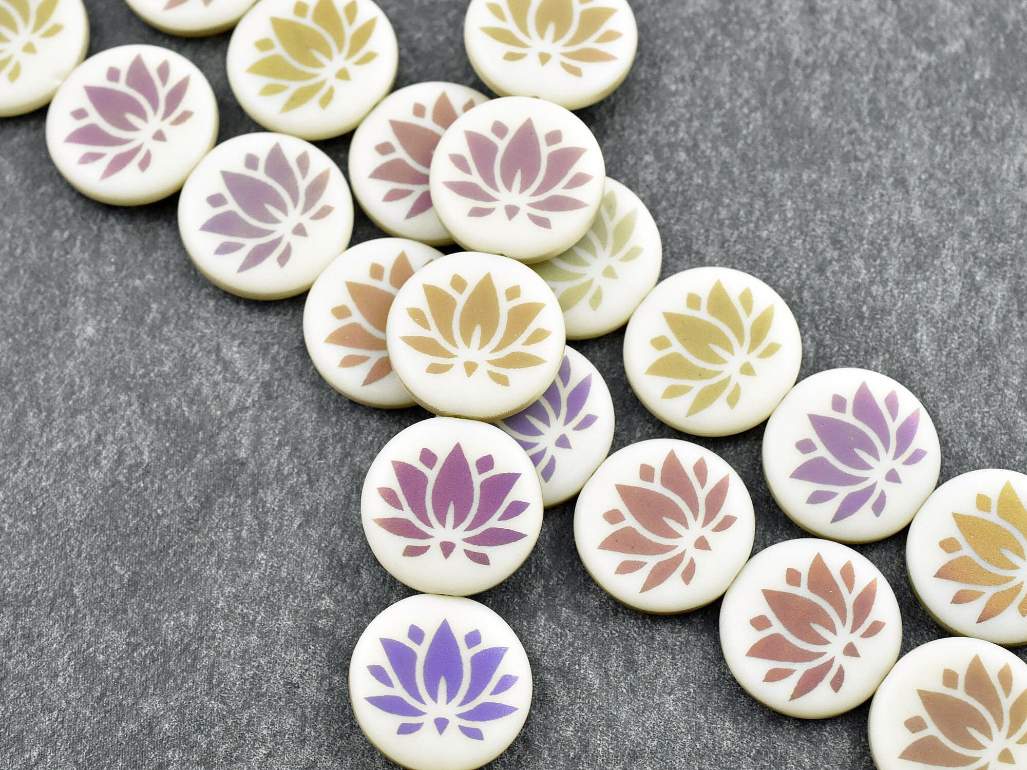♥ Type/Shape: Czech glass coin beads with laser etched lotus flower design (both sides of bead)