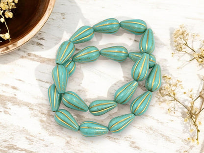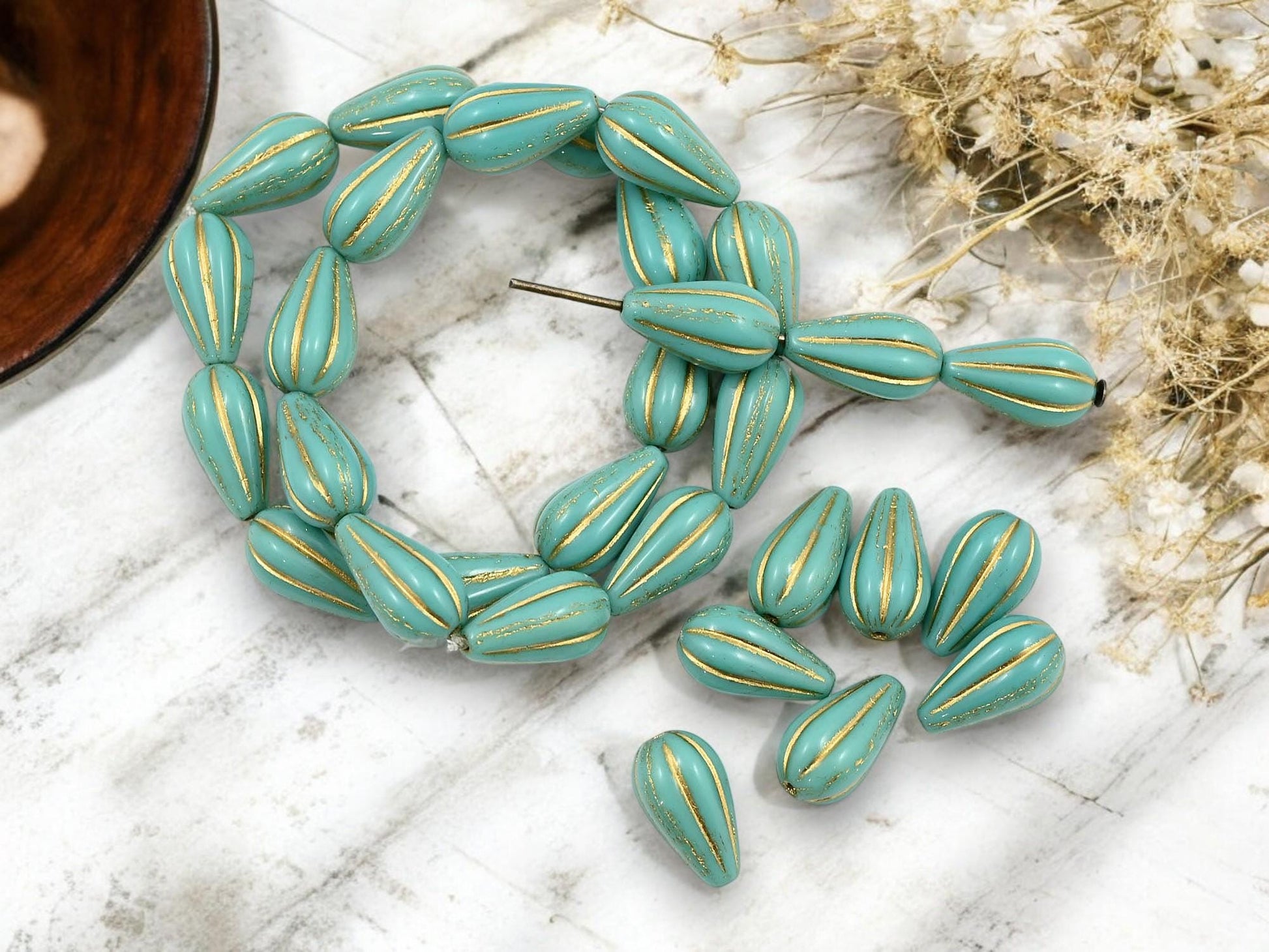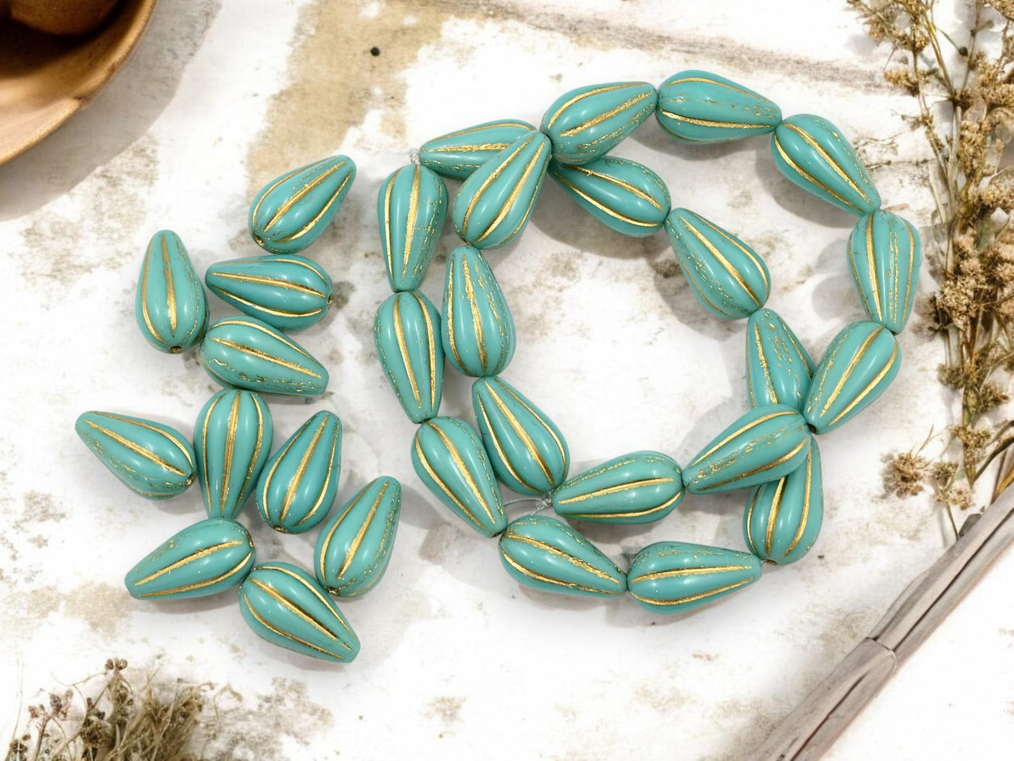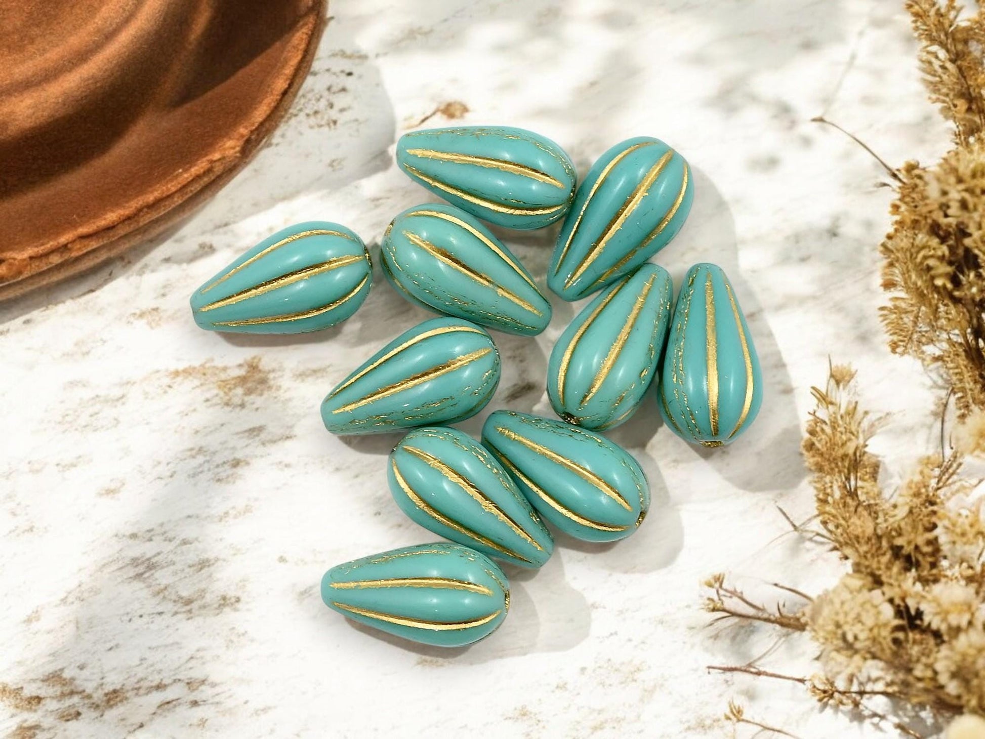*10* 13x8mm Gold Washed Opaque Turquoise Melon Drop Beads