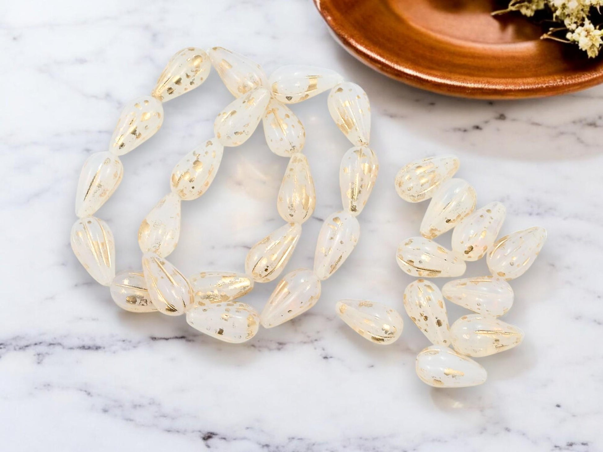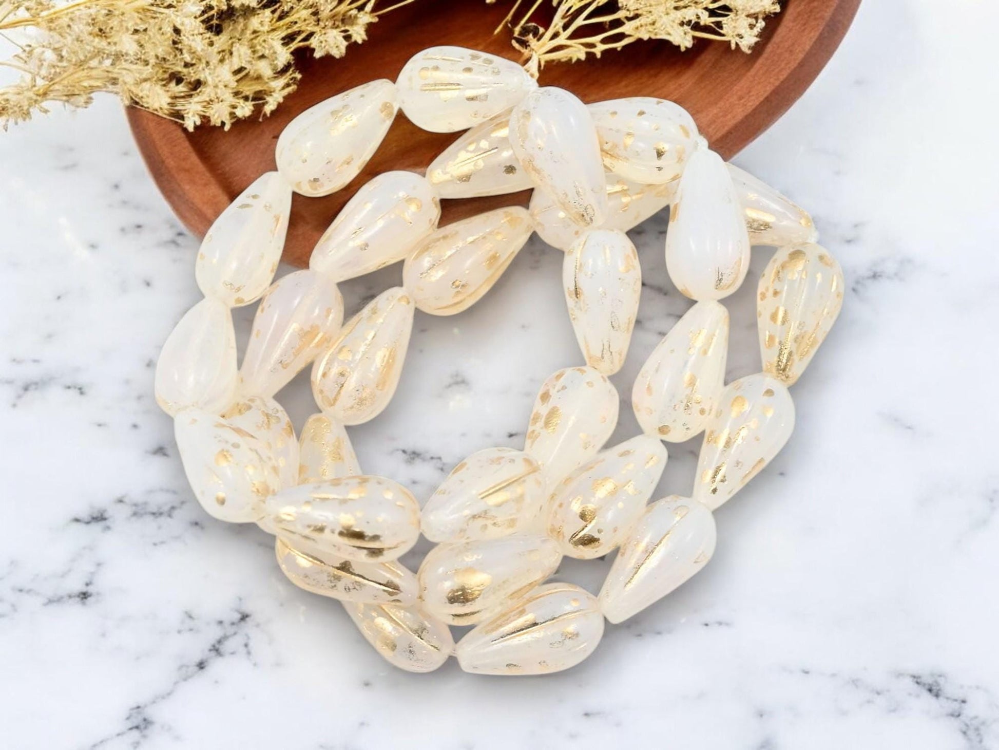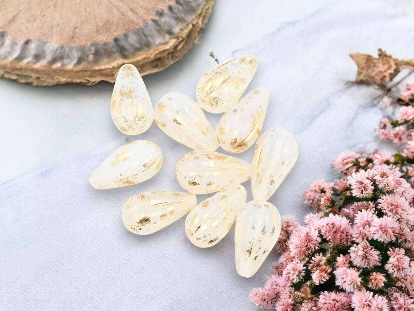 *10* 13x8mm Antique Gold Washed Milky Crystal Opaline Melon Drop Beads