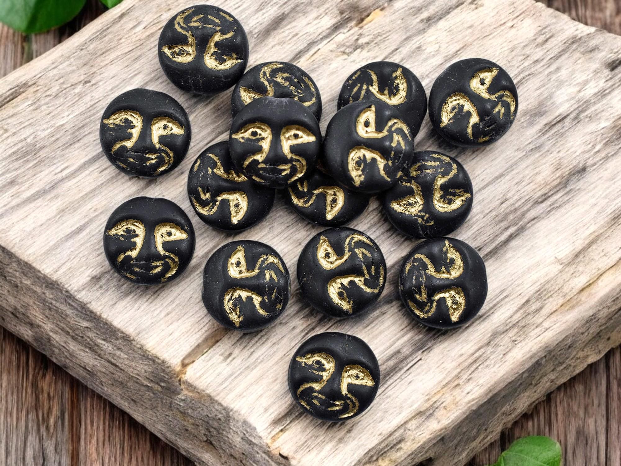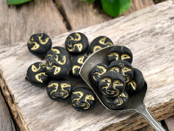 *15* 13mm Gold Washed Matte Jet Black Moon Face Coin Beads