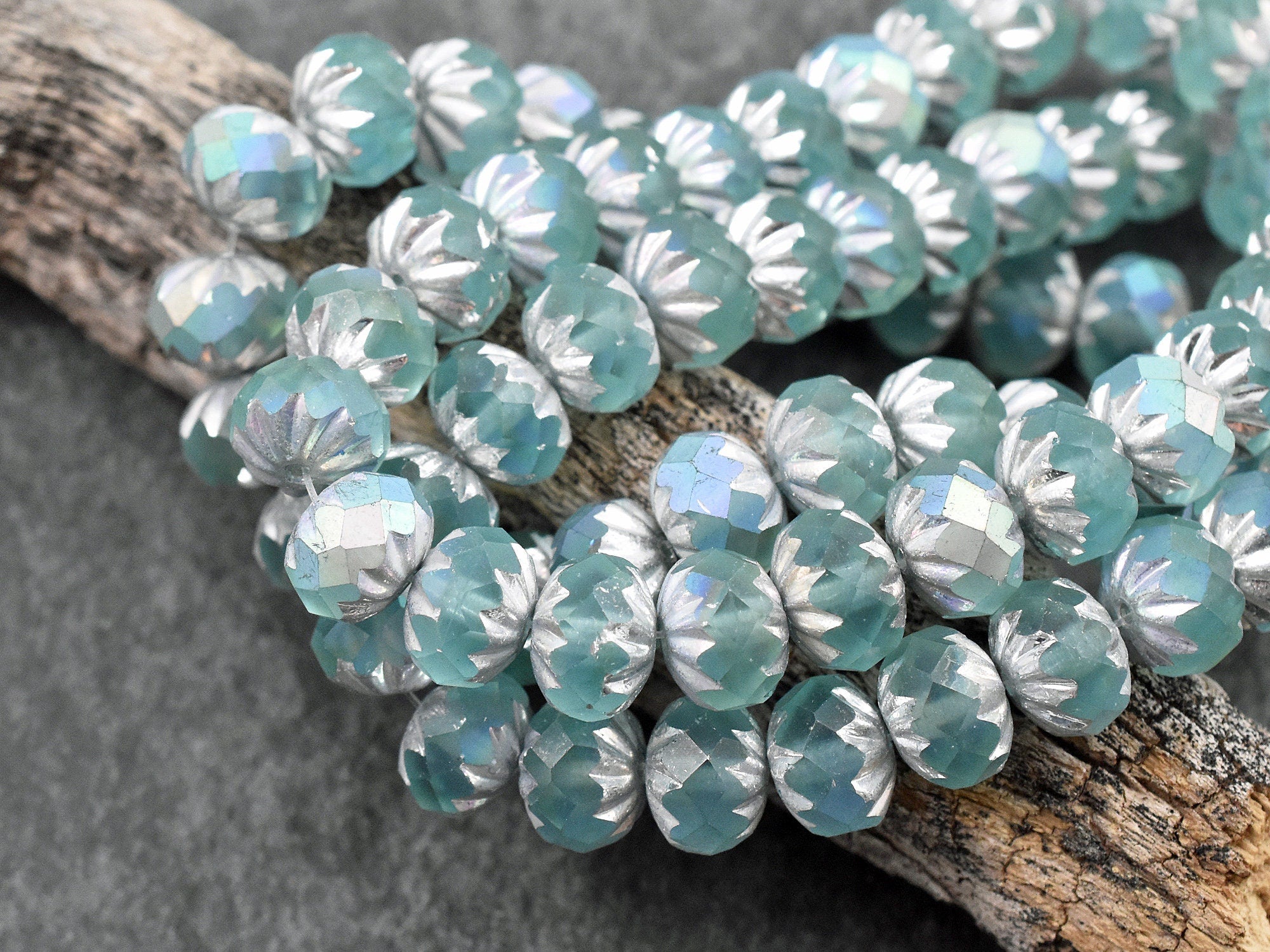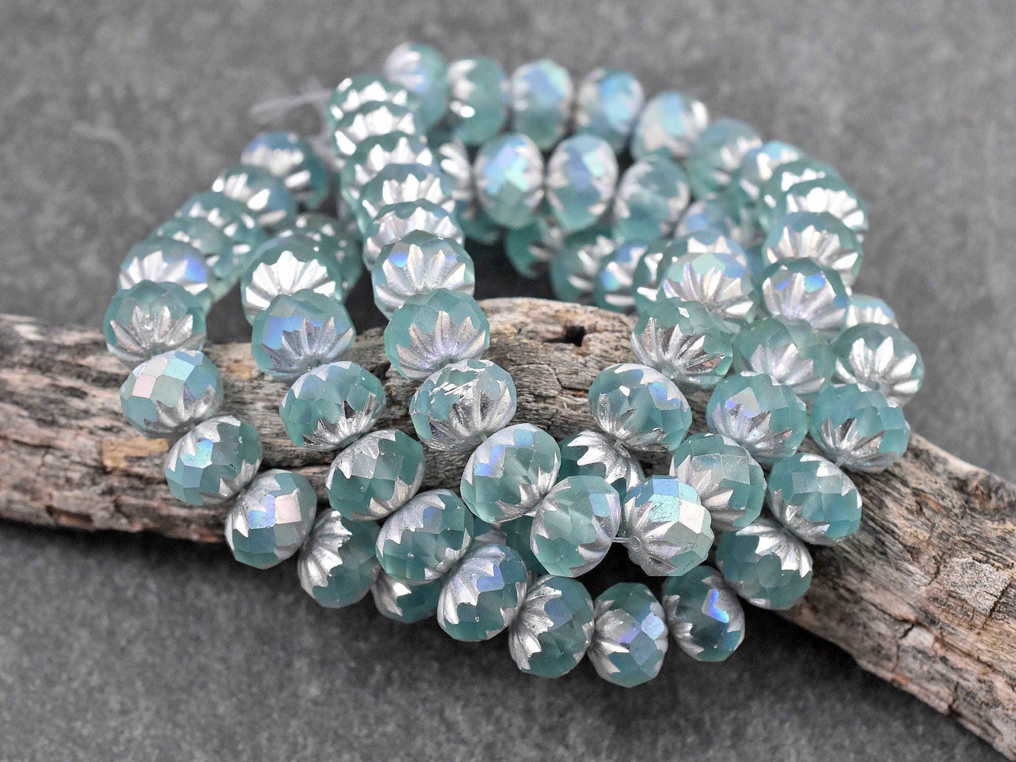 *25* 6x9mm Silver Washed Matte Blue Teal AB Fire Polished Cruller Rondelle Beads