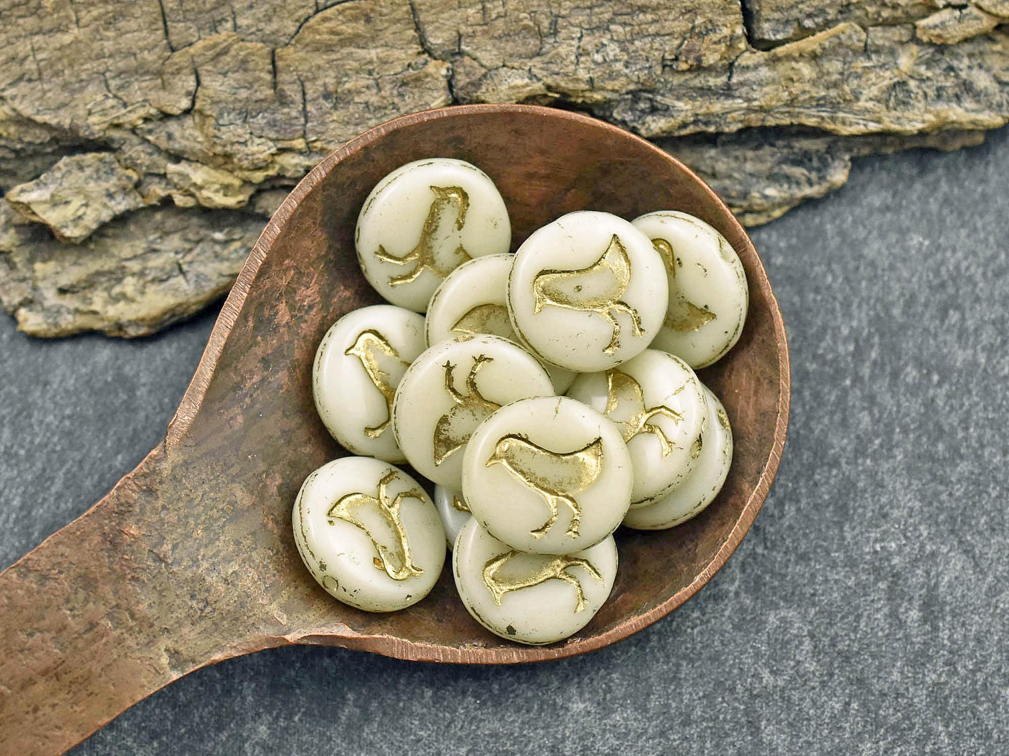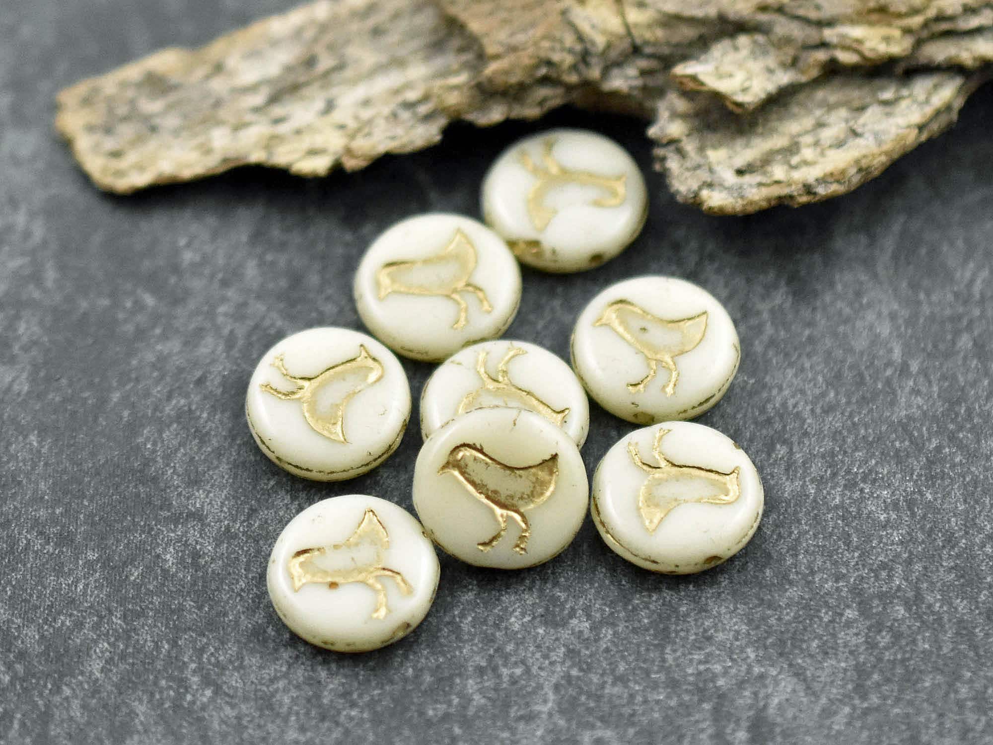 *15* 12mm Gold Washed Opaque Beige Bird Coin Beads