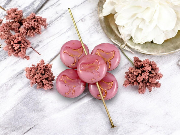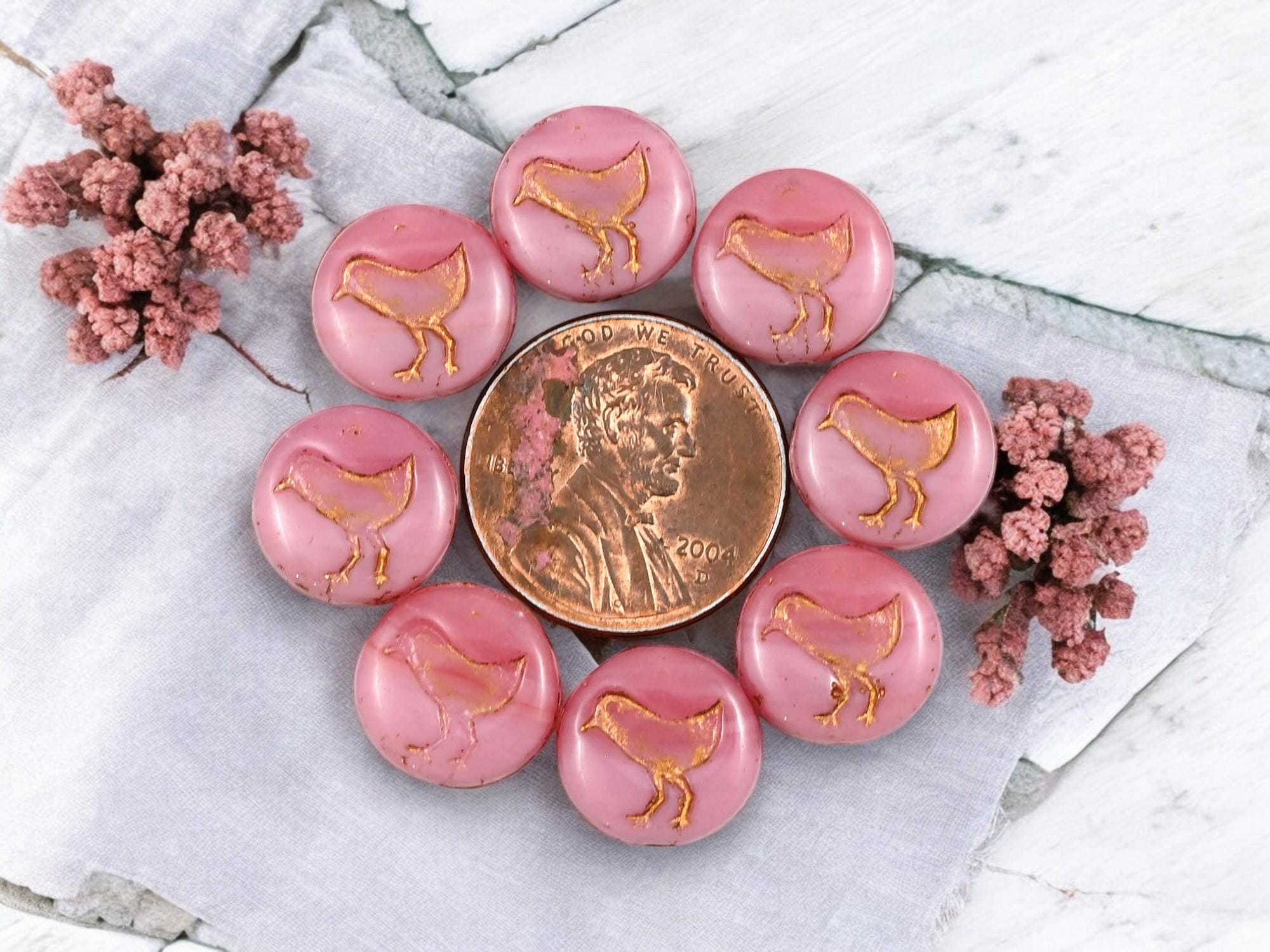 *15* 12mm Bronze Washed Opaque 2 Tone Pink Bird Coin Beads