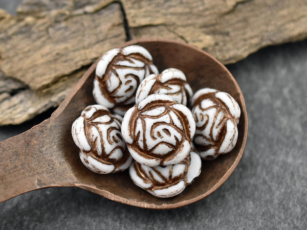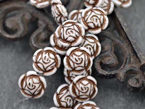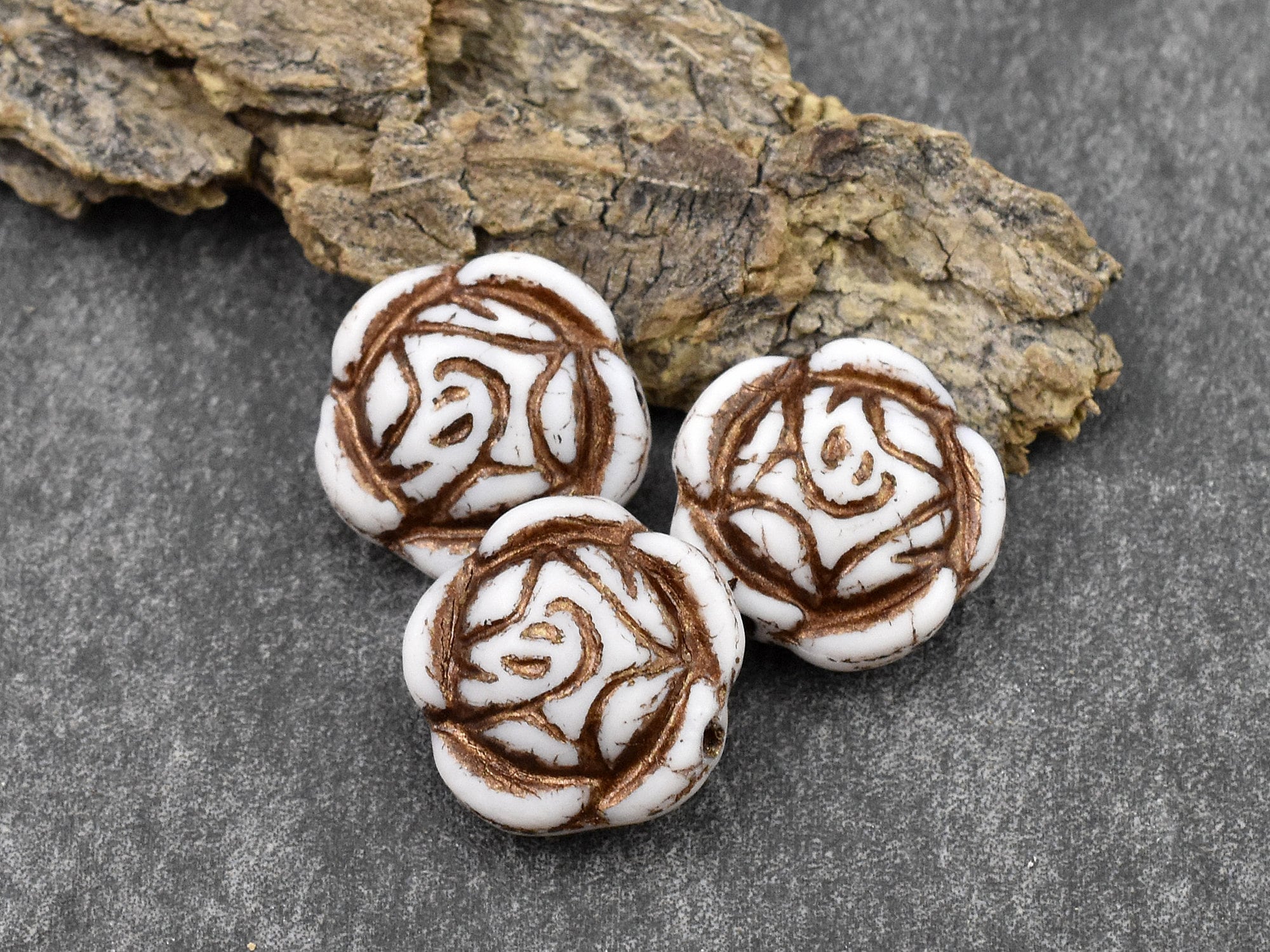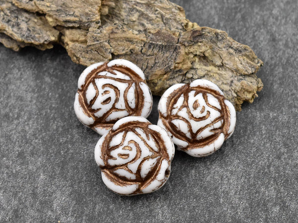 *6* 17mm Dark Bronze Washed Matte White Rose Flower Coin Beads