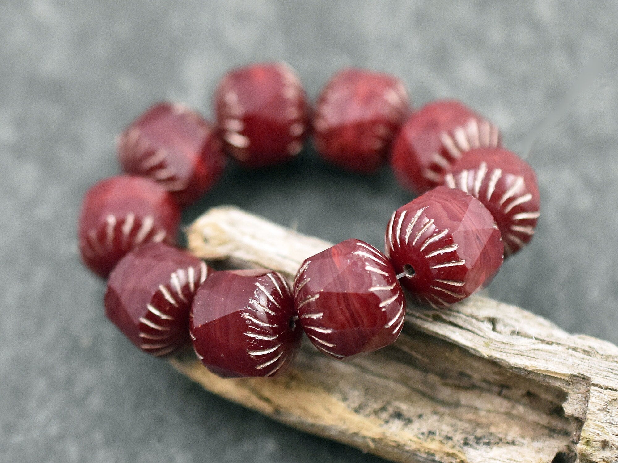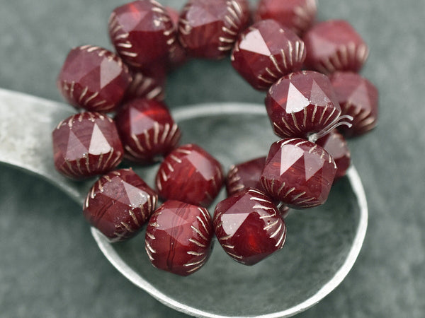 *10* 10mm Platinum Washed Red Opaline Center Cut Cruller Beads