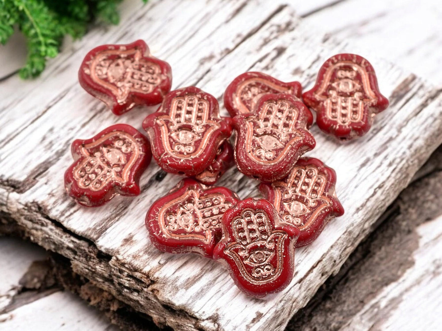 *10* 15x10mm Copper Washed Opaque Cardinal Red Hamsa Hand Beads