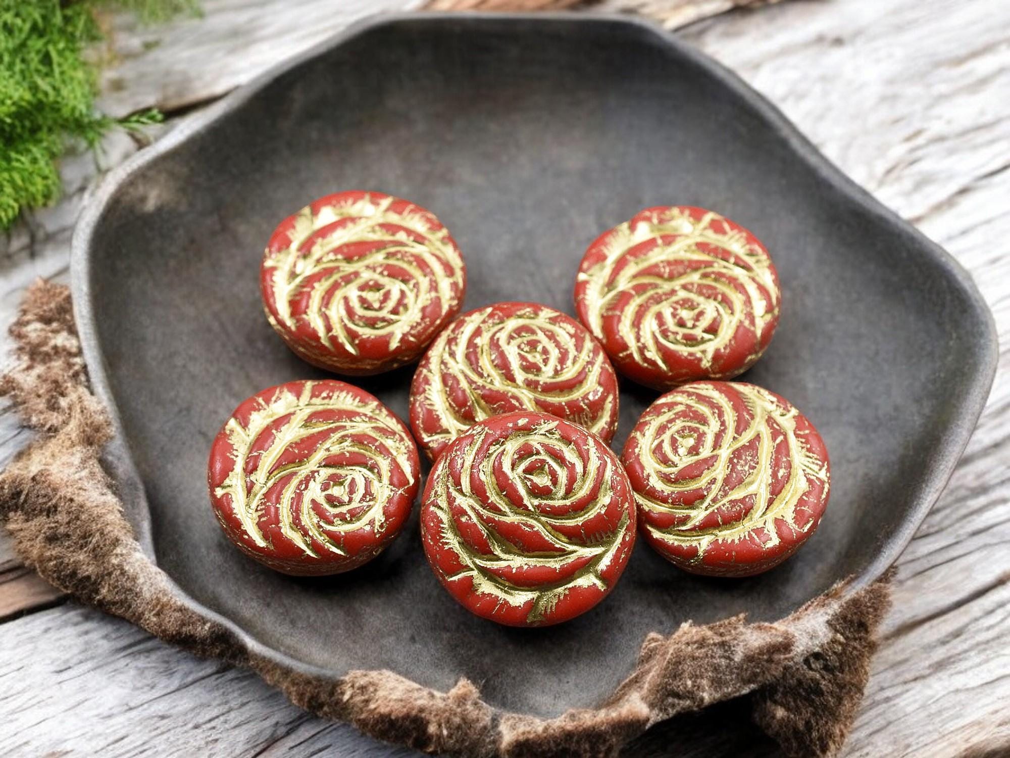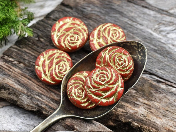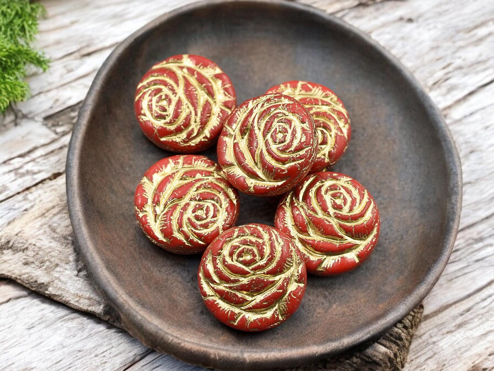 *6* 18mm Bronze Washed Opaque Red Rose Flower Coin Beads