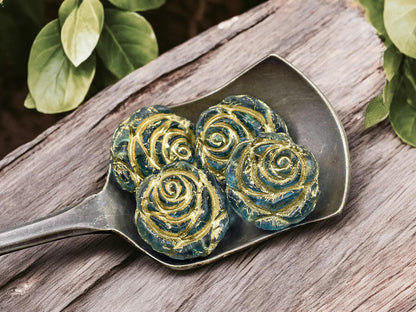 *10* 14mm Bronze Washed Aqua Rose Flower Beads