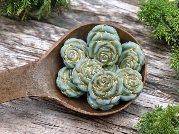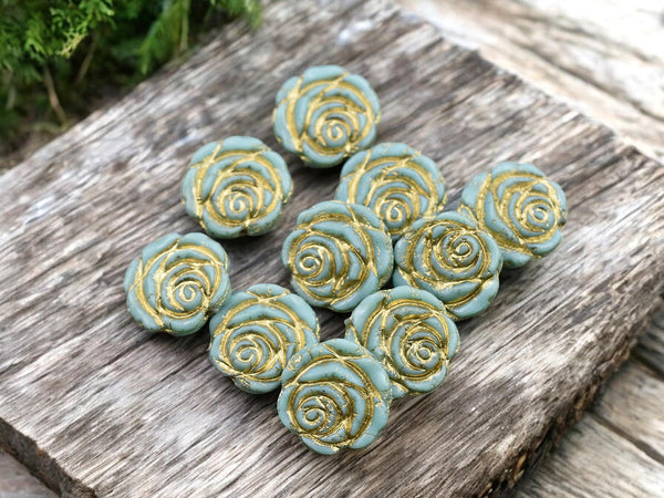 *10* 14mm Bronze Washed Turquoise Rose Flower Beads